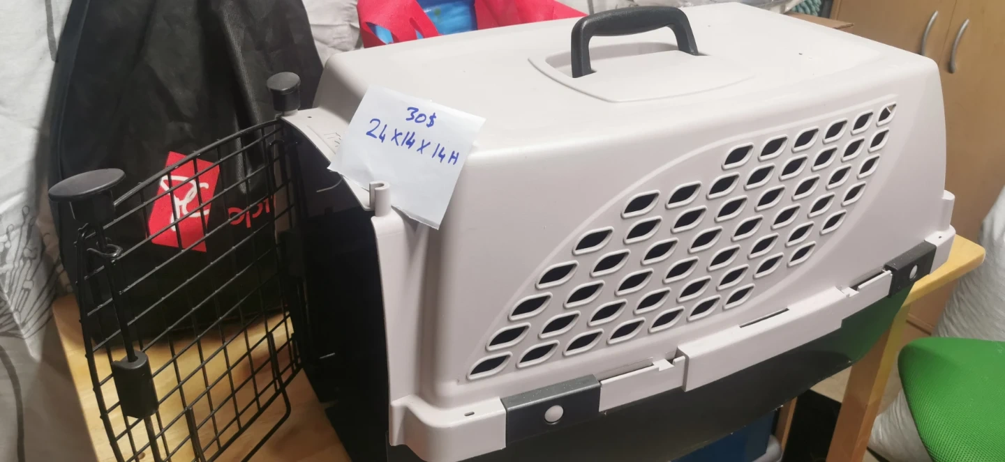 Used pet carrier, perfect for small to medium-sized pets. It's a sturdy plastic construction with ventilation slots on the sides and front. Includes a wire door for secure access. Dimensions are 24 inches long, 14 inches wide, and 14 inches high. Ideal for travel or vet visits!