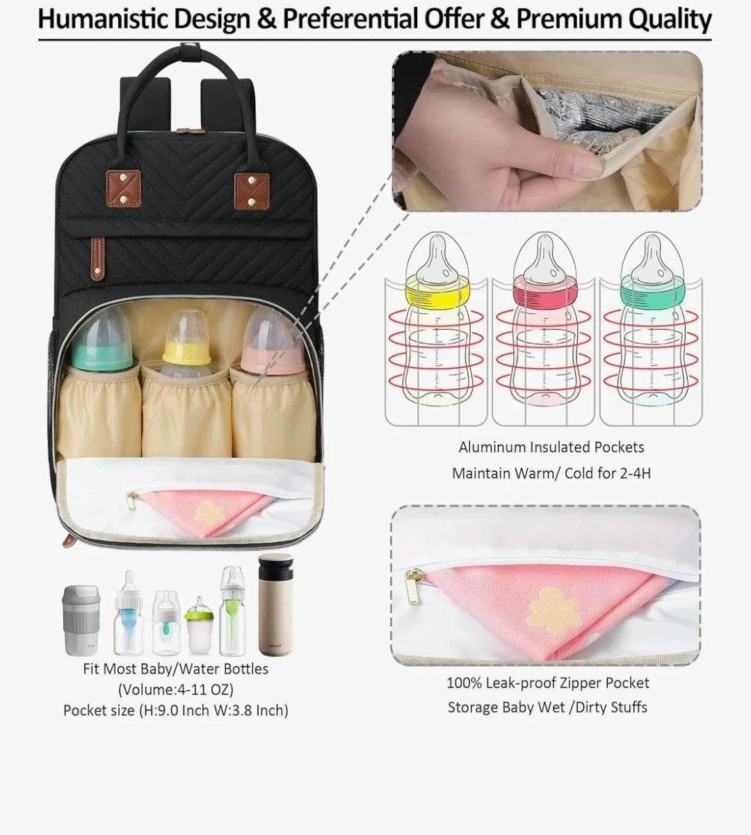 This diaper bag backpack is black with chevron stitching and faux leather accents. It features aluminum insulated pockets designed to maintain warm or cold for 2-4 hours. It also includes a 100% leak-proof zipper pocket for storing wet or dirty items.