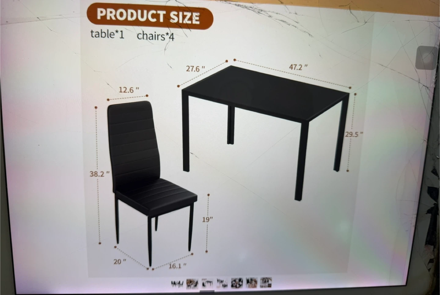 This set includes one dining table and four chairs. The table measures 47.2" long, 27.6" wide, and 29.5" high. Each chair is 20" wide, 16.1" deep, and 38.2" high with a 19" seat height. It's suitable for various scenarios!