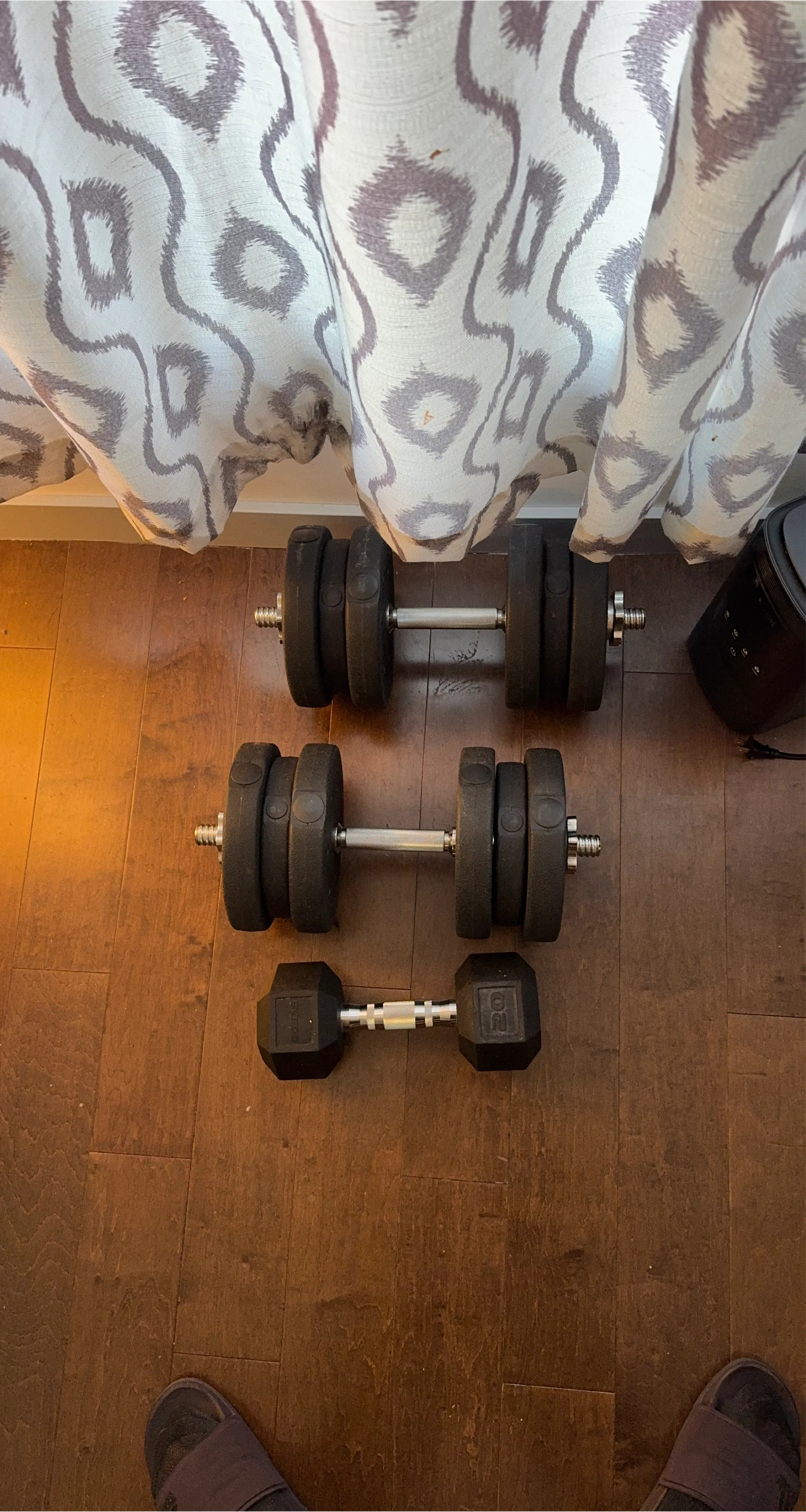 Includes two adjustable dumbbells and a set of weights. Dumbbell handles have textured grips for better control. Hexagonal weight ends prevent rolling. Great for strength training at home!