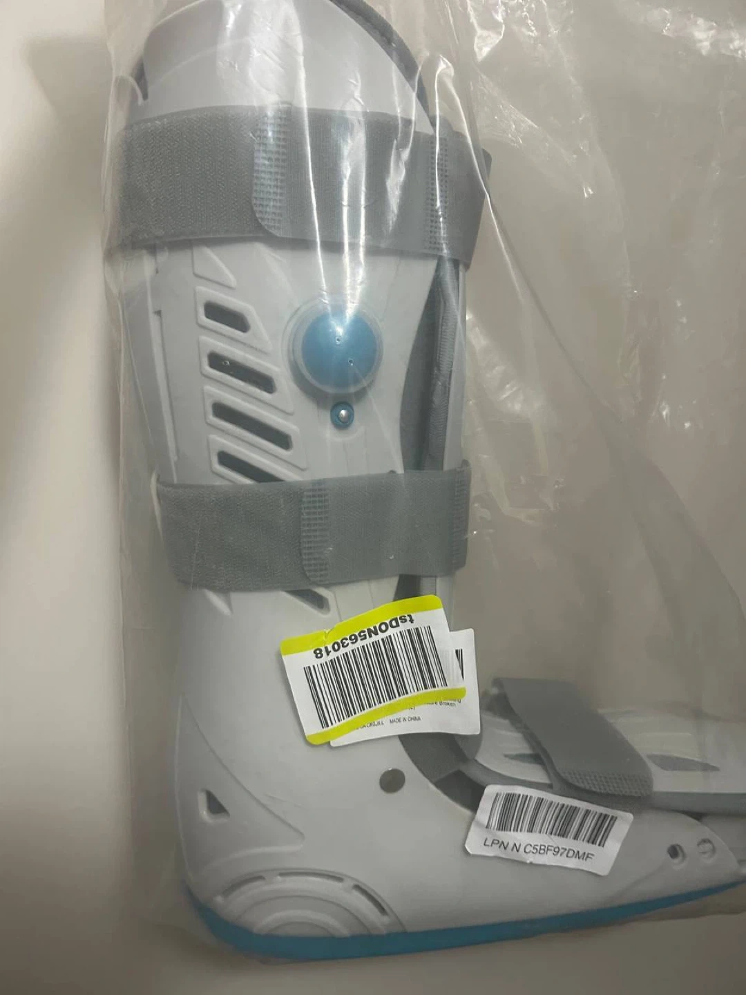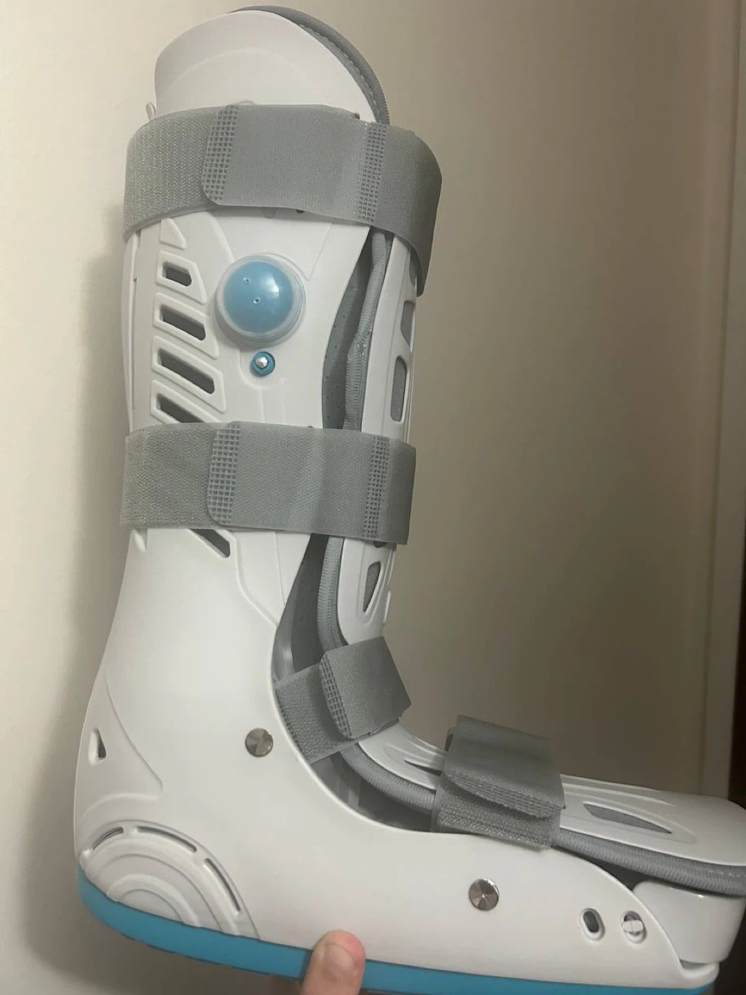 10Selling a new orthopedic walking boot. It's in good condition and ready to help with recovery. It's white with grey straps and a blue accent on the bottom.
