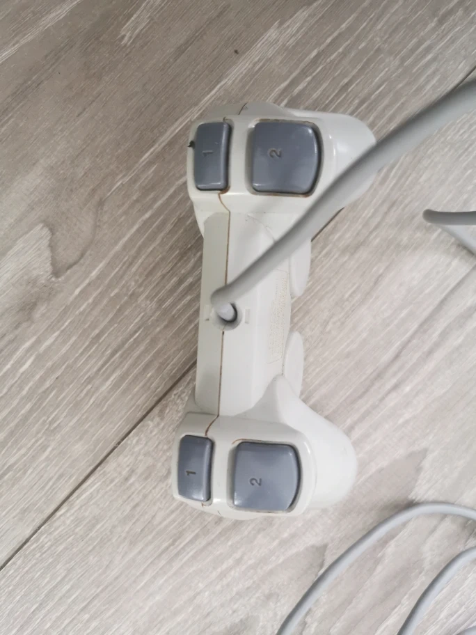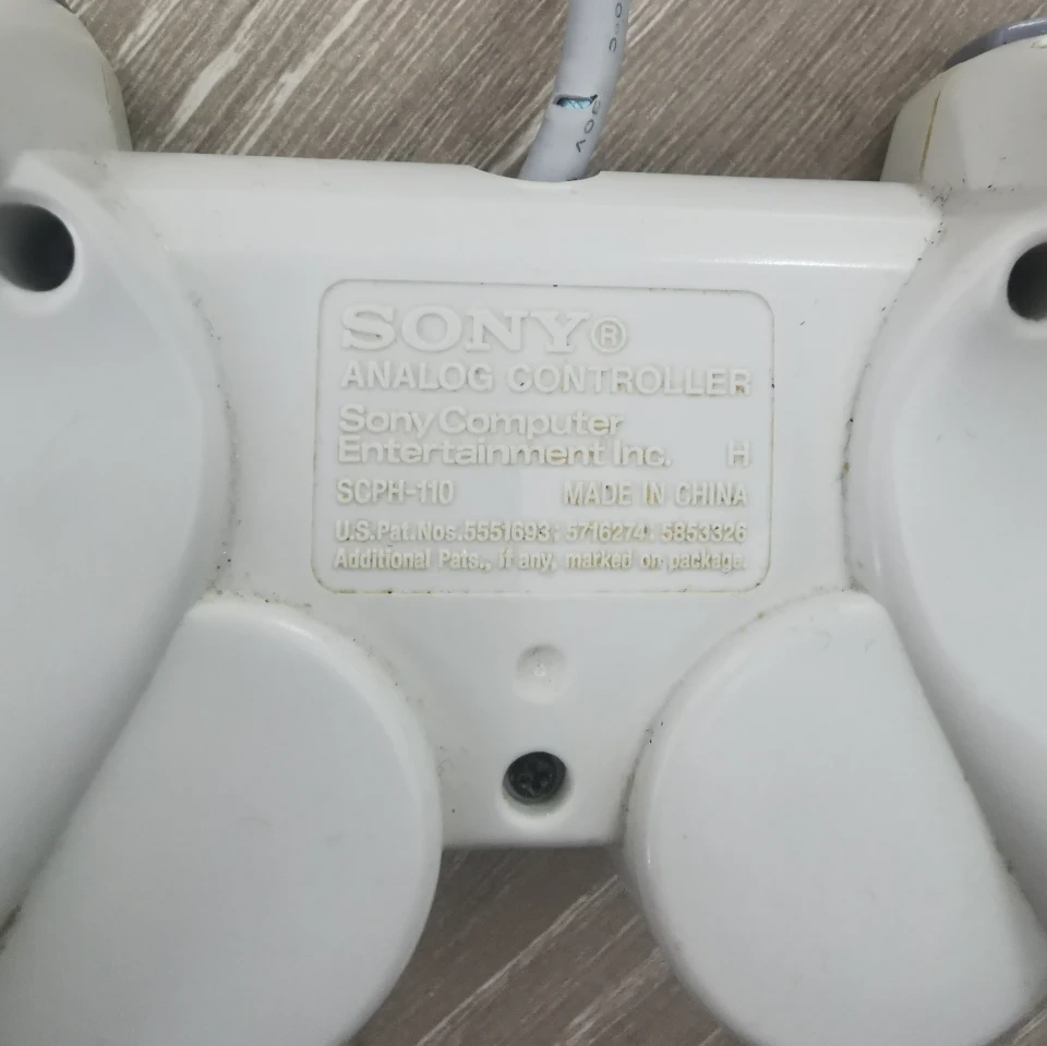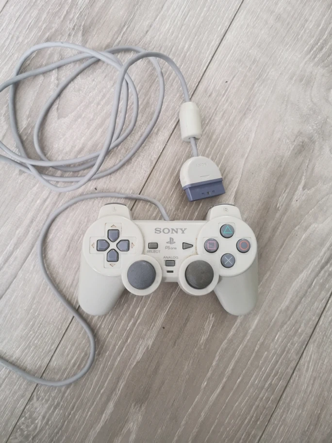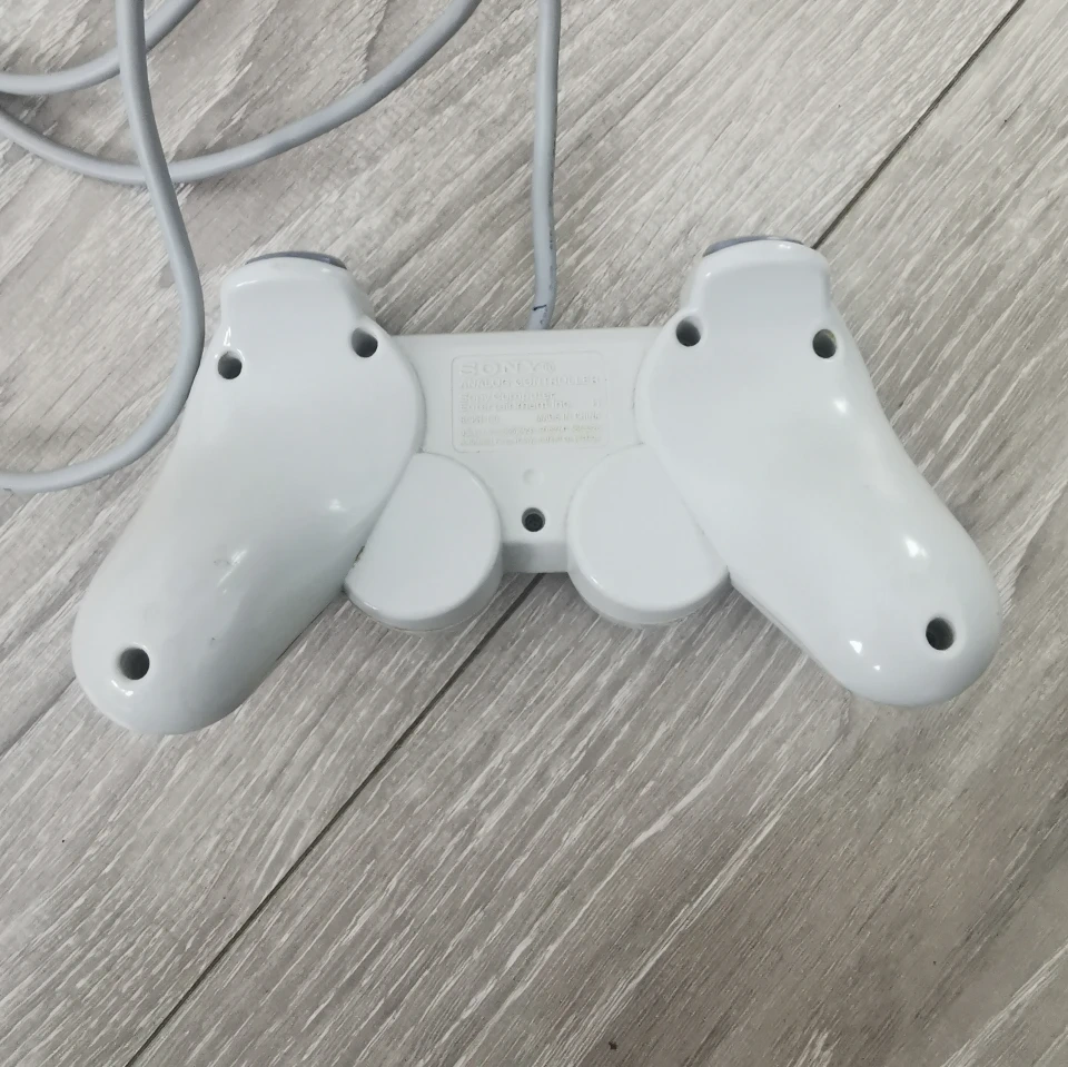White Playstation DualShock controller. Features analogue sticks and directional pad. Includes cord.