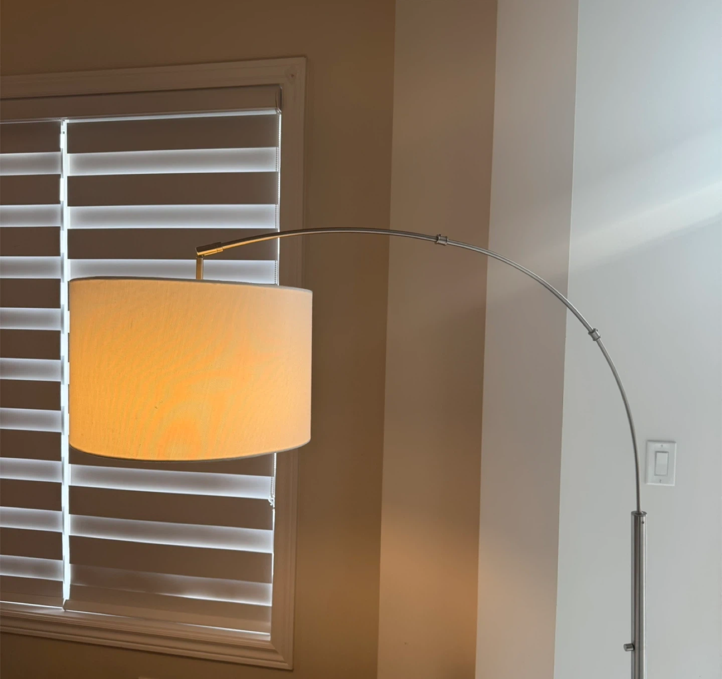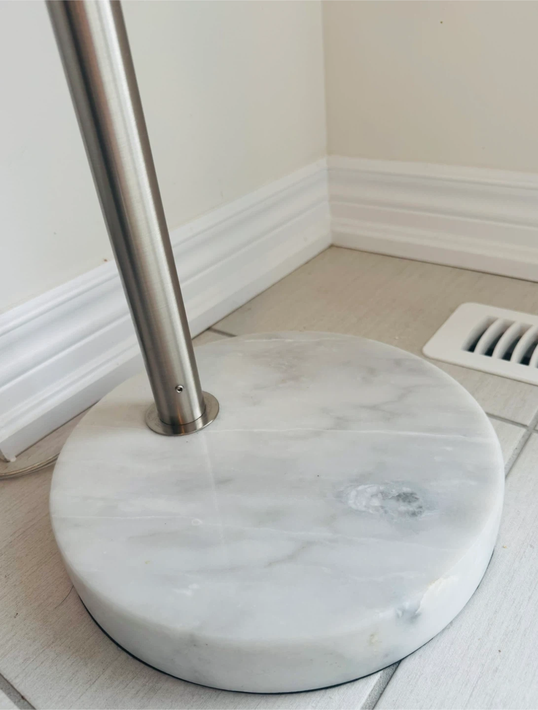 Stylish arc floor lamp featuring a brushed nickel finish and a weighted marble base. It's perfect for adding ambient lighting to living rooms or reading nooks. The lamp includes a large, neutral-toned shade.