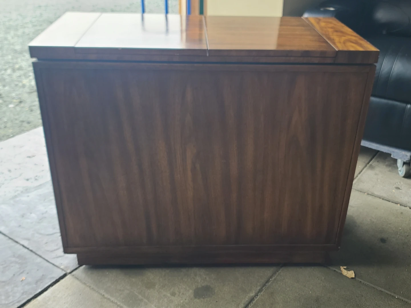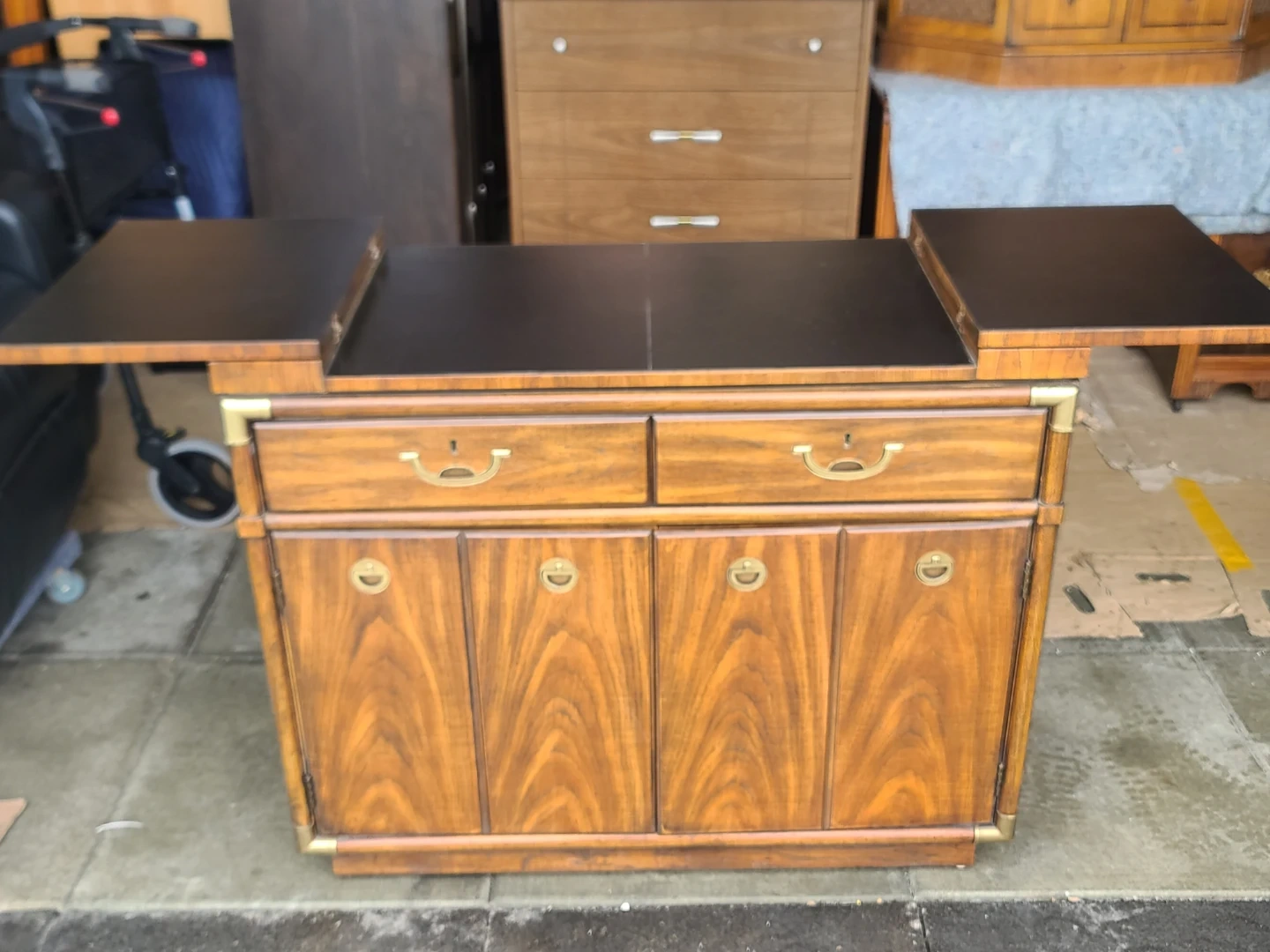 Classic wood bar cabinet. Has campaign style brass hardware and corner accents. Two drawers on top for storage. Two cabinet doors below open to reveal shelves inside. Top expands for extra serving space. It's a sturdy piece that would be great for a dining room or living area. Measurements: W 40" X D 20" X H 33". Delivery can be arranged. Viewing and pickup by appointment.