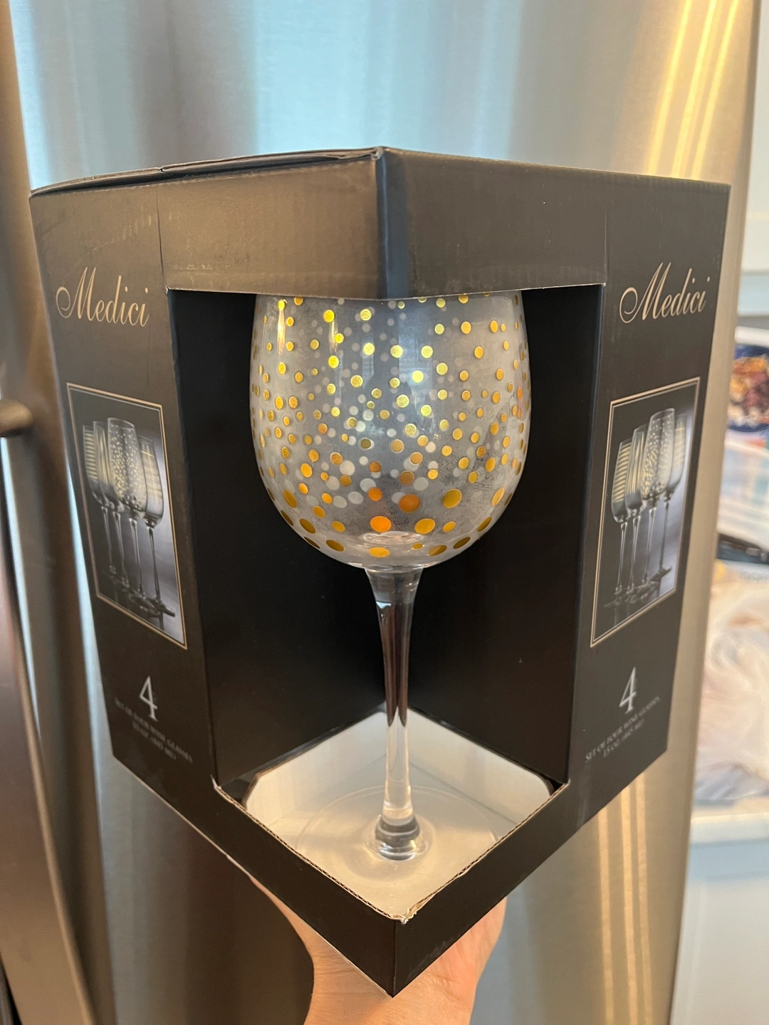 Set of four 15 oz wine glasses. Each glass features a gold and white polka dot design. The glasses are in their original box.