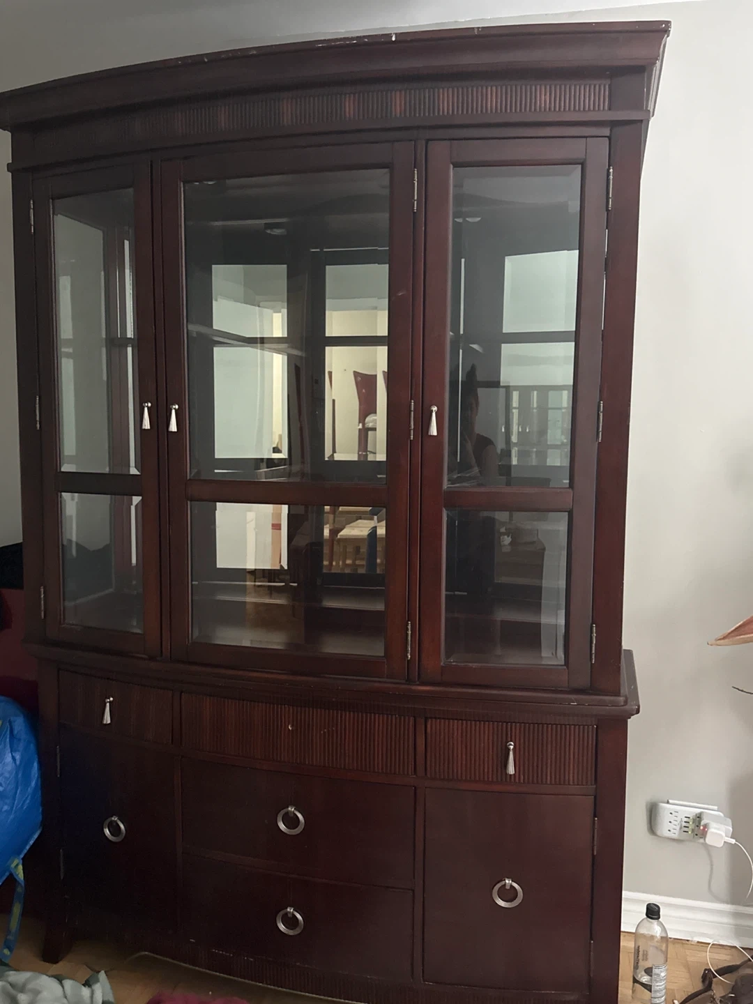 A beautiful dark wood china cabinet with glass doors. It has multiple shelves for display and storage. This cabinet would be a lovely addition to any dining room or living space. The glasses have been dismantled for move out. In good shape need hands to move so make sure you have 2 strong men. Comes out in two parts. Selling because we are moving out