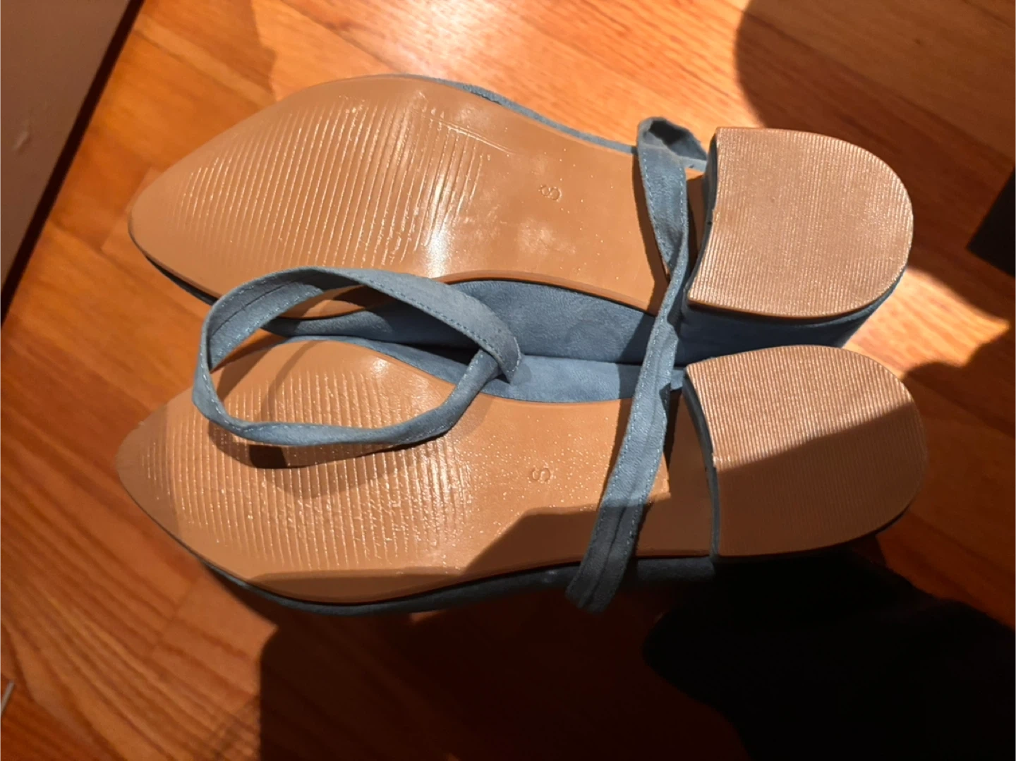 These stylish women's shoes are made with a soft blue suede material. They feature a comfortable block heel and an adjustable ankle strap. Size is small (34/35), perfect for warmer weather occasions!