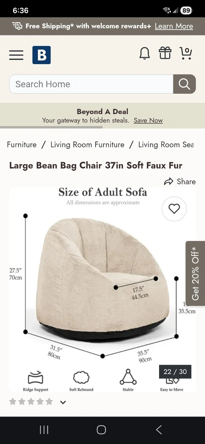 This large bean bag chair is upholstered in soft faux fur. It's designed for comfort and relaxation. Dimensions are approximately 70cm H x 80cm W x 90cm D.