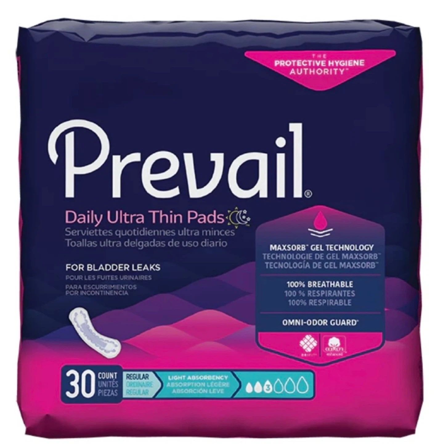 These Prevail Daily Pads offer maximum absorbency for bladder leaks. They feature MaxSorb gel technology for leakage protection. Omni-Odor Guard helps prevent odour. These are 100% breathable pads.