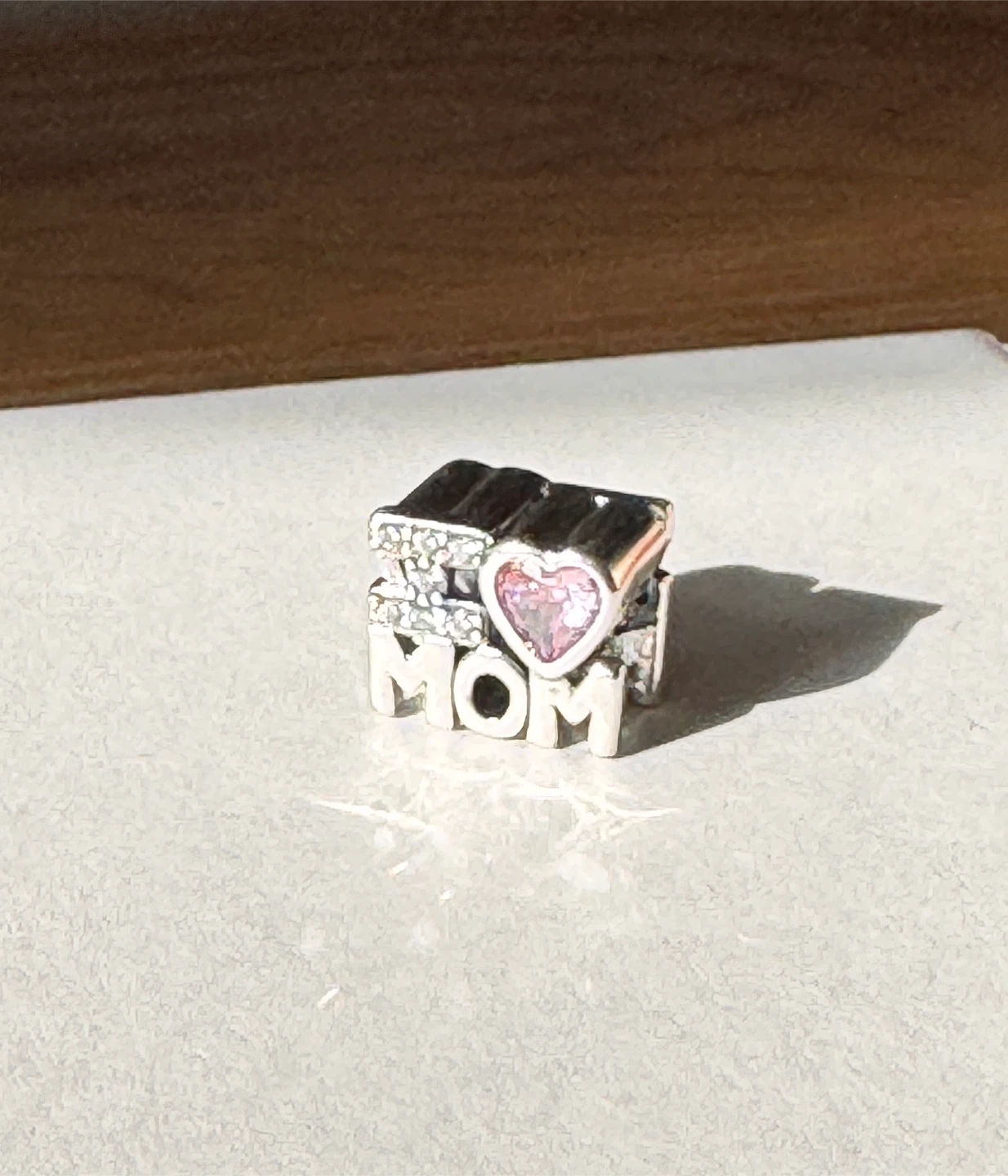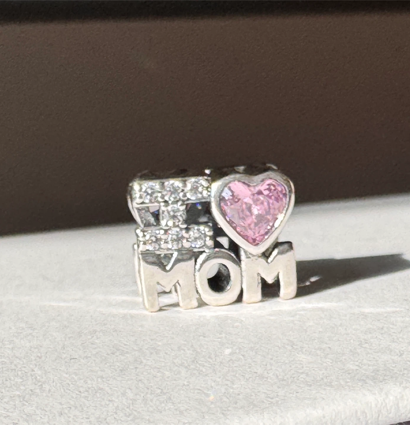 This is a sterling silver charm featuring the words "I Love Mom" with a pink heart. It's stamped with "S925" indicating sterling silver. It's a sweet gift for any mom!