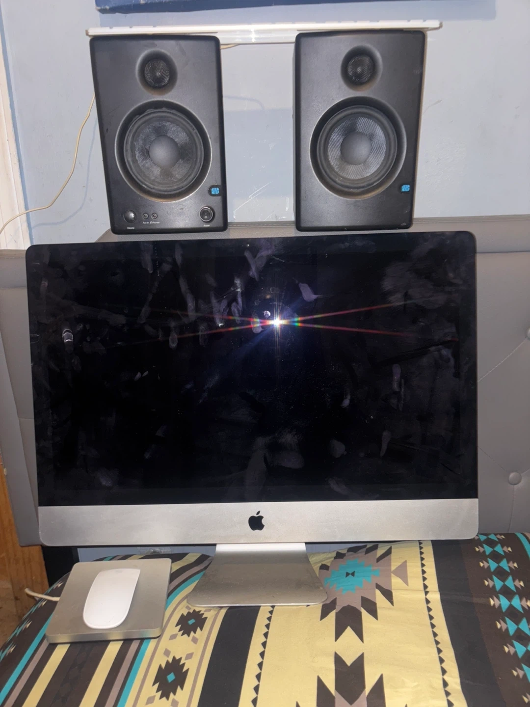 This listing includes an Apple iMac desktop computer. It comes with a pair of Studio speakers and a Magic Mouse. This setup is ready for your creative projects or daily tasks! ( has macOS Catalina installed )