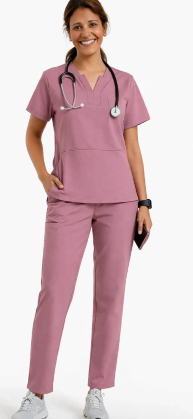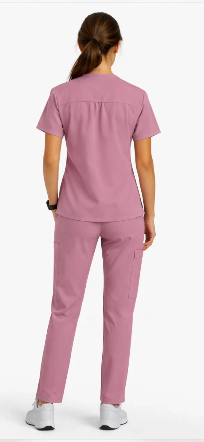 This is a women's scrub set in a dusty rose colour. It includes a V-neck top with a chest pocket and drawstring pants with multiple pockets. The fabric is soft and durable for all-day comfort.