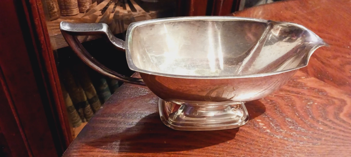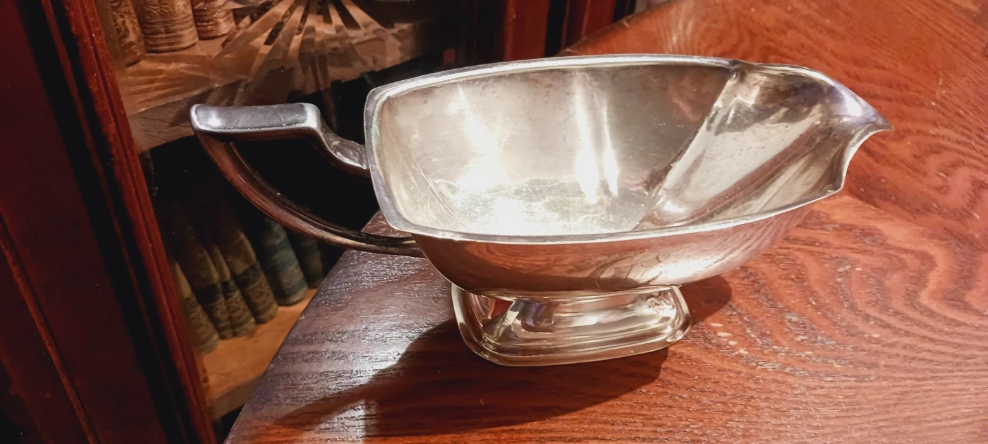 This is a classic silver-plated gravy boat. It features a sturdy handle and a spout for easy pouring. Its polished finish adds an elegant touch to any table setting. 9"×4'. ALL MY PRICES ARE NEGOTIABLE !!