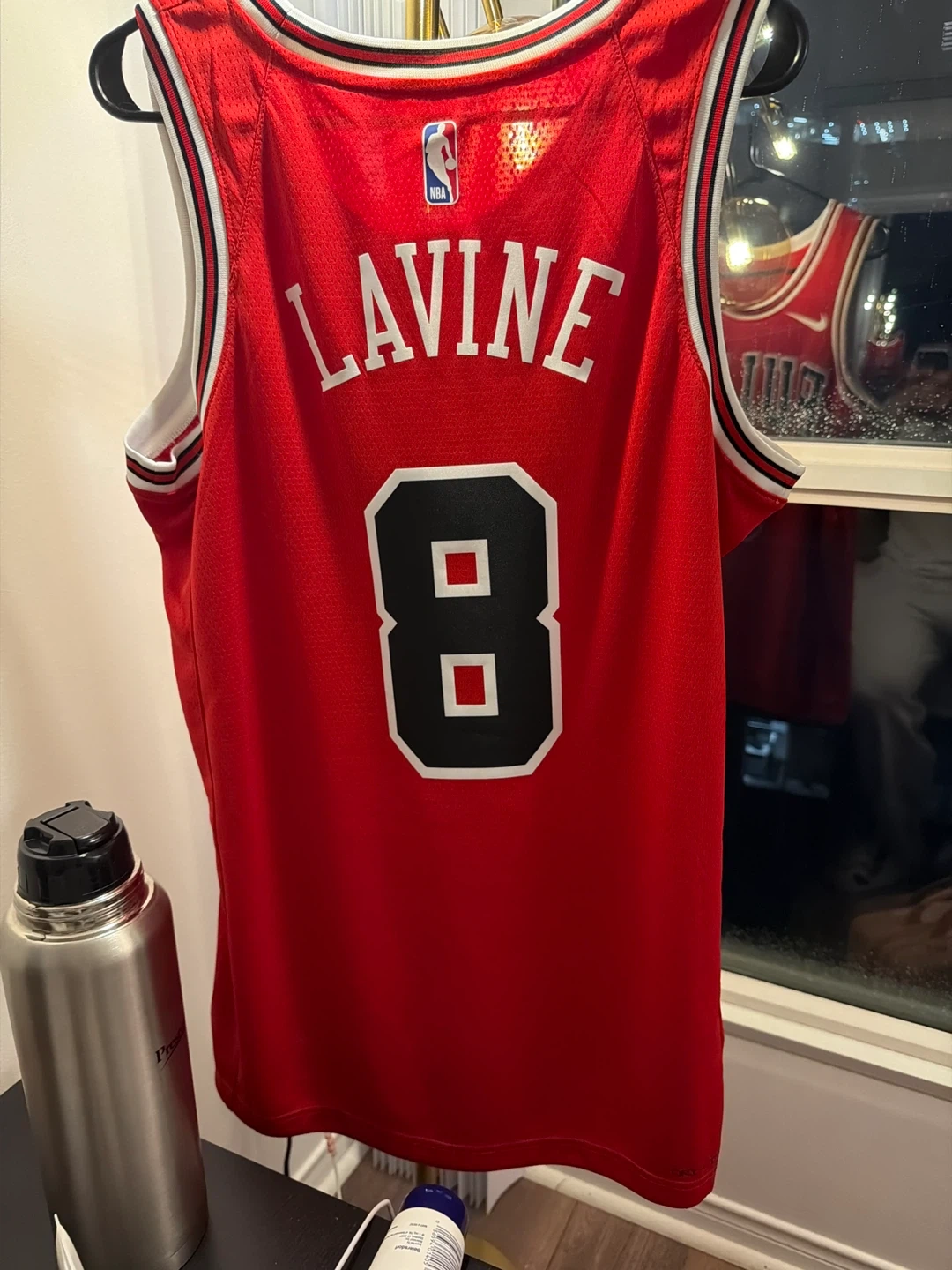 Nike Dri-FIT NBA Chicago Bulls Icon Edition jersey. Features Zach Lavine's name and number 8. Size 44, made in Thailand. Engineered to exact specifications of championship athletes.