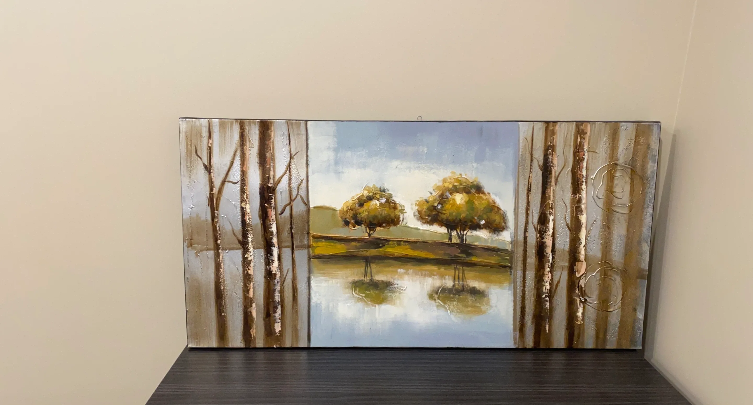 This is a triptych wall art piece featuring a serene landscape with trees and their reflection in the water. It's painted with textured acrylics for a dimensional effect. Adds a calming touch to any room!