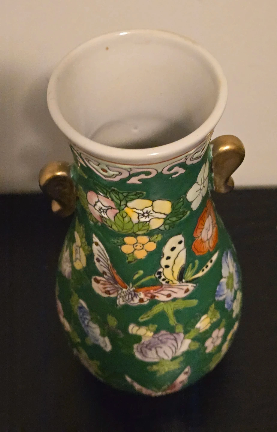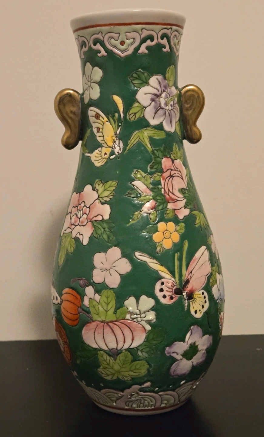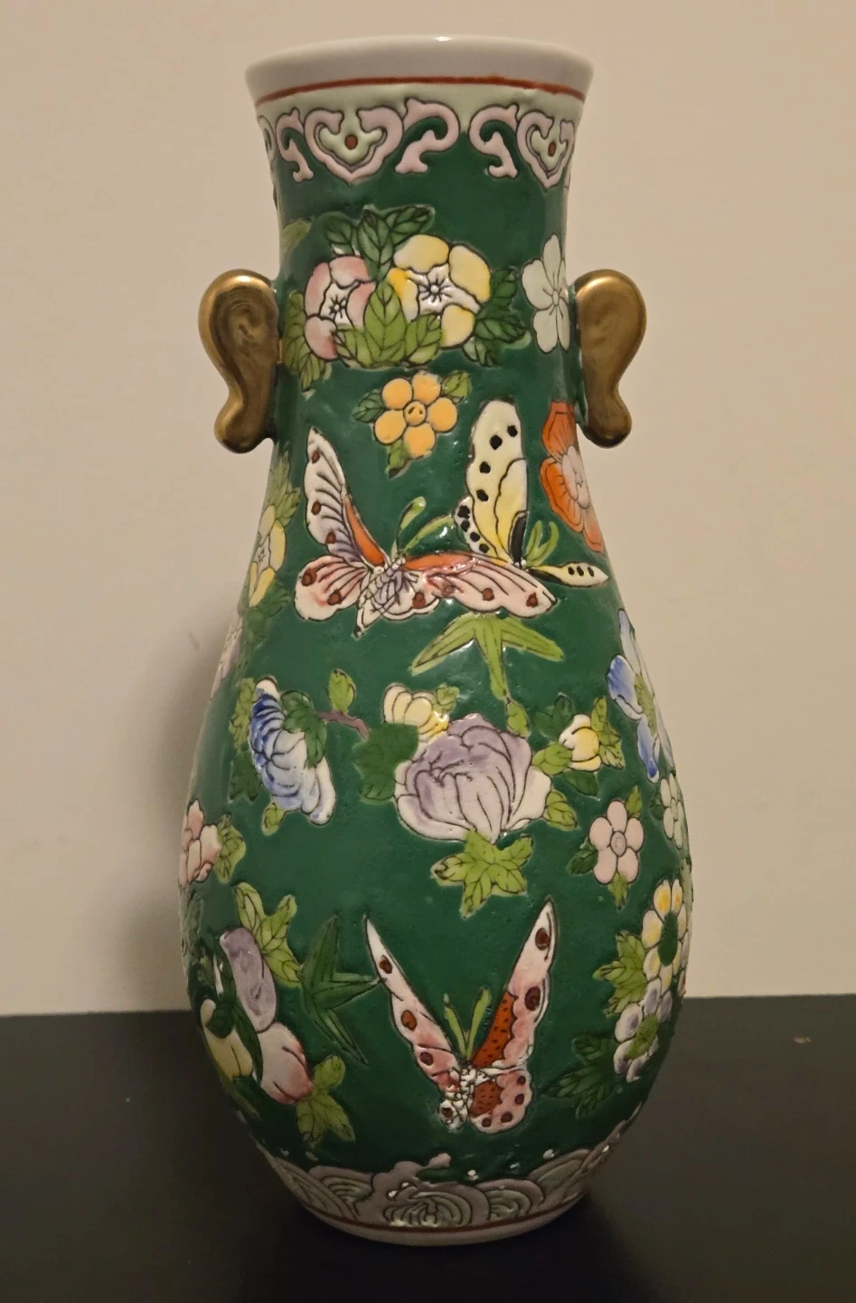 Vintage Mid Century Chinese Famille Rose Hand Painted Porcelain Vase With Butterfly and Floral Motifs On A Deep Green Ground. Excellent Condition, no chips or cracks. 8" Height.