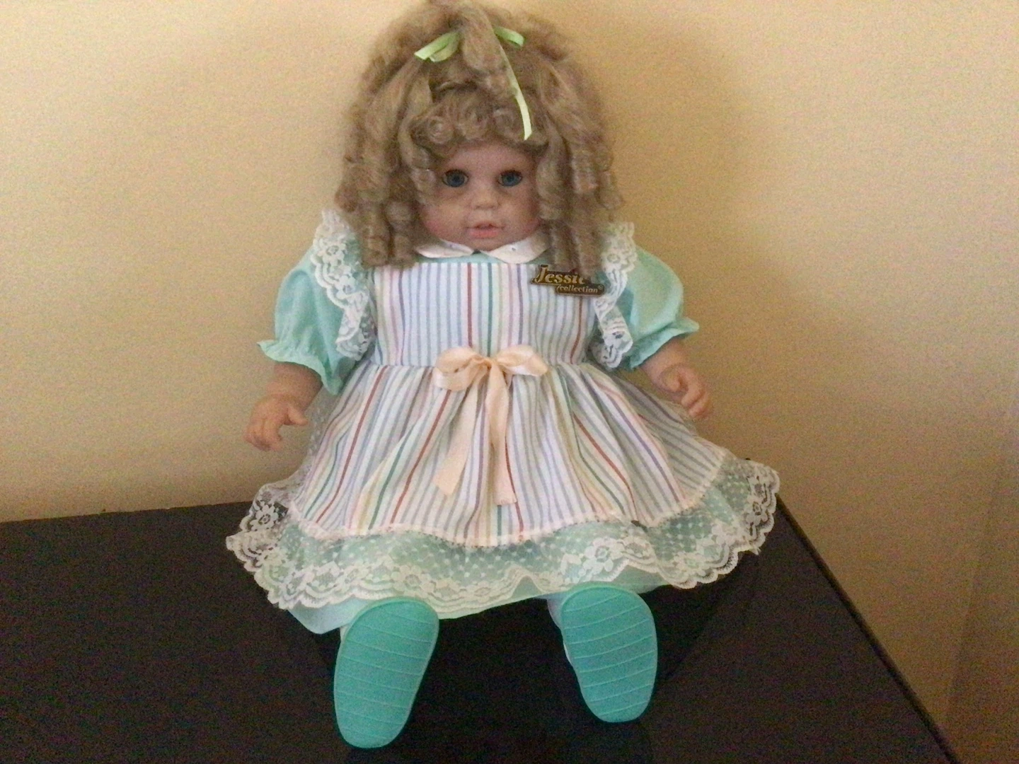 A Jessie Collection doll with curly blonde hair and blue eyes. It's wearing a dress with colourful vertical stripes, a white lace collar and cuffs, and a pale pink bow. This doll is approximately 18 inches tall.