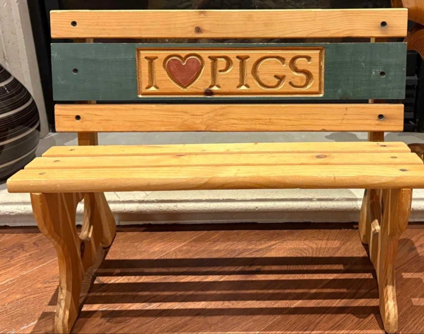 Selling a children’s wooden bench with a cute design that says "I ❤️ PIGS"! It's a unique piece, perfect for adding a touch of whimsy to your home or garden. The bench is sturdy and well-made, with a natural wood finish. It's in great condition and ready for a new home!