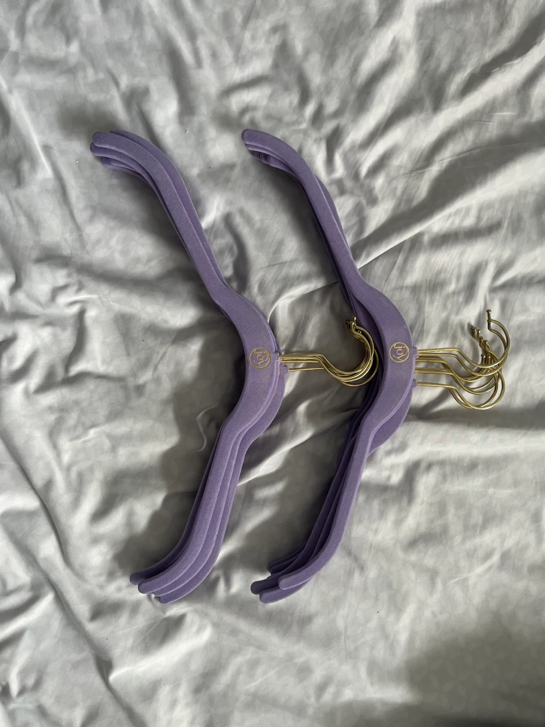 This is a set of 16 purple velvet hangers. They have a soft, non-slip surface to keep clothes in place. The gold metal hook swivels 360 degrees for easy hanging. Perfect for organizing your closet!