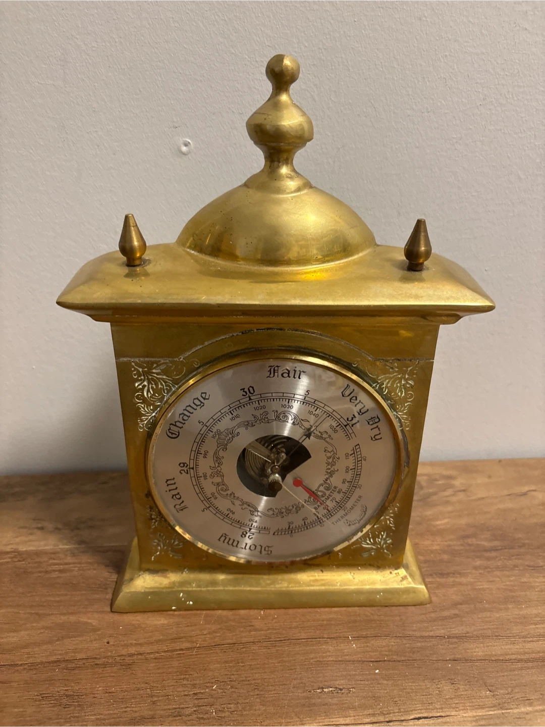 This is a brass barometer . It has a decorative design and indicates weather changes. It's a classic piece for any home!