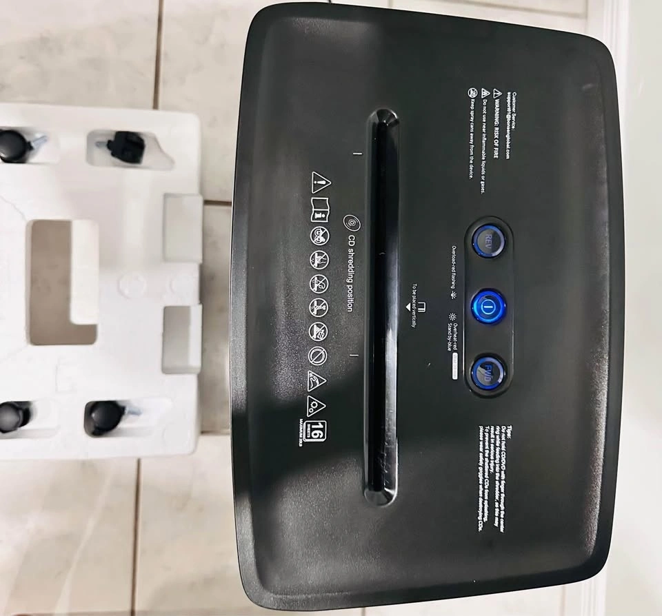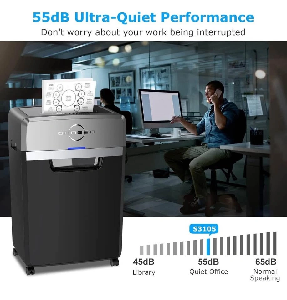 BONSEN heavy-duty paper shredder in like-new condition, in its original packaging. Handles up to 24 sheets at once with a 40-minute continuous run time. Features a 9-gallon bin and 55dB super quiet operation. P-4 security level for safe document shredding. Perfect for home or office use.
