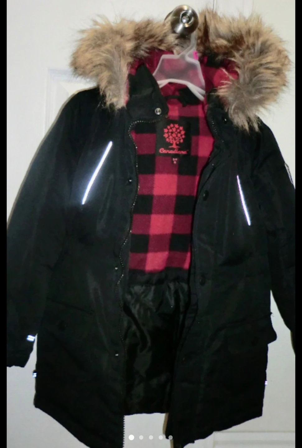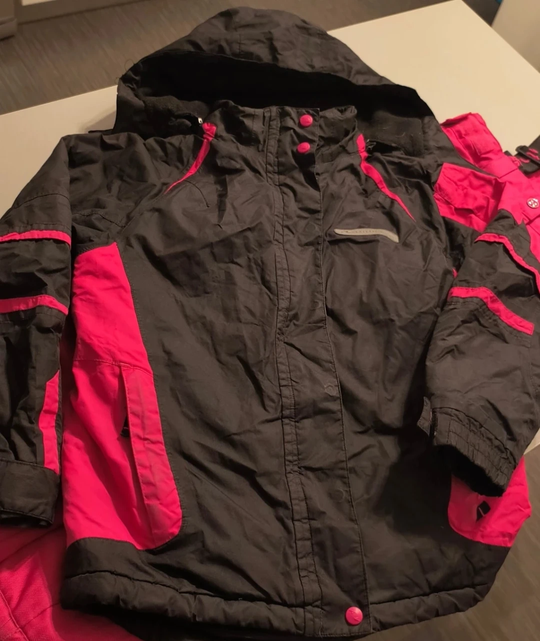 This girls' winter set includes a black and pink insulated jacket and matching snow pants. The jacket has a faux-fur trimmed hood and reflective accents. The snow pants are bright pink with adjustable suspenders. Perfect for keeping warm during winter activities!