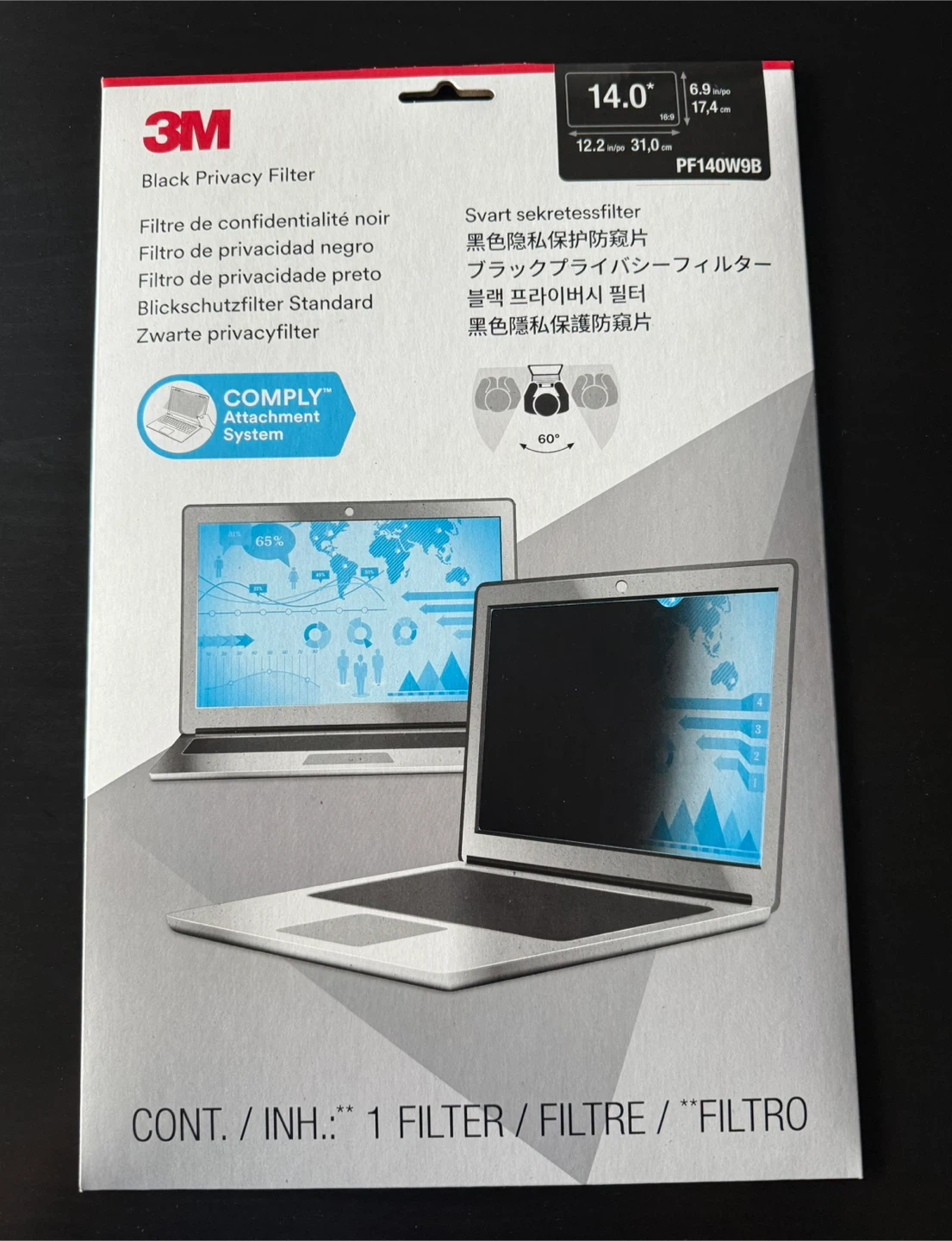 Selling a brand new 3M Black Privacy Filter for a 14-inch laptop! It helps keep your screen private with its COMPLY attachment system, ensuring only you can see what's on your screen. Perfect for working in public spaces!