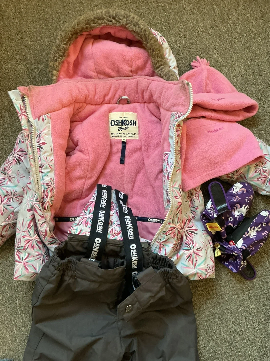 60Here's a cute OshKosh Bgosh snowsuit set, perfect for keeping your little one warm this winter! The set includes a floral jacket with a fur-trimmed hood, snow pants with OshKosh branded suspenders, a matching hat and neck warmer. Gloves are included, strap slight broken. Size 4 Snowsuit