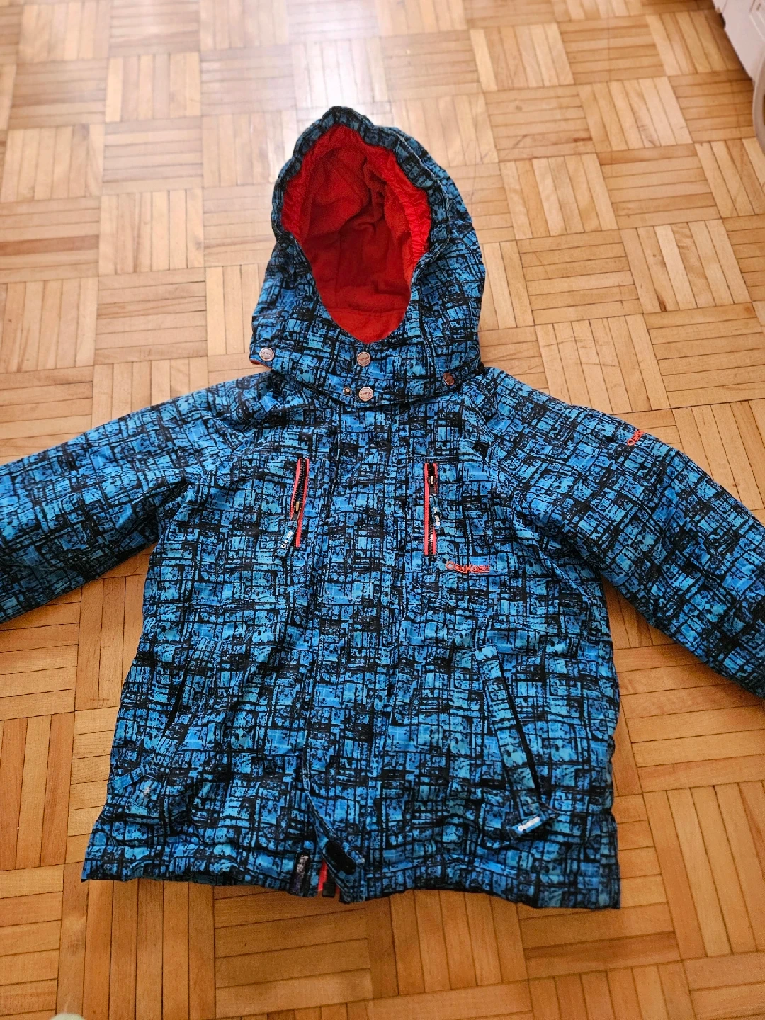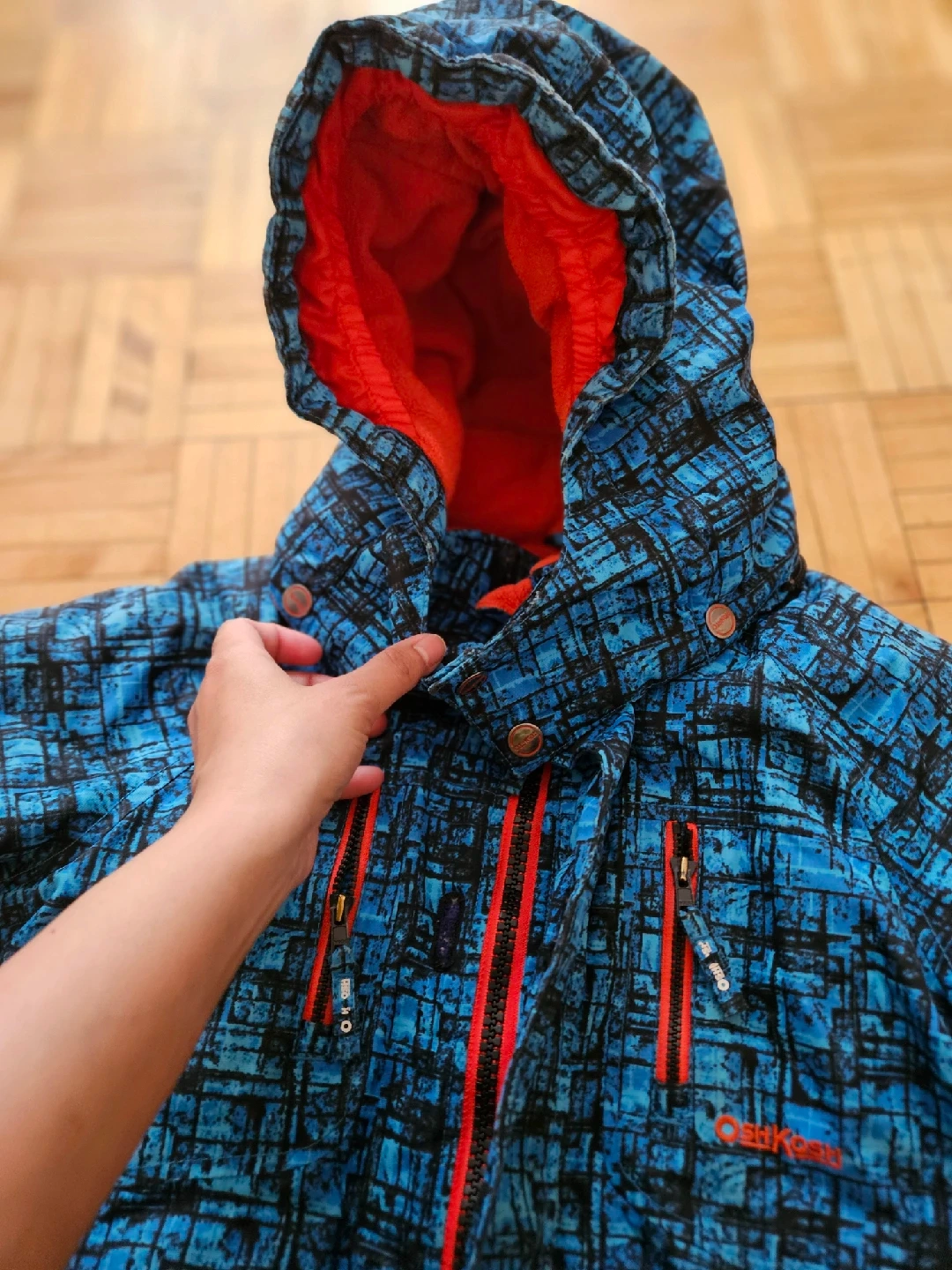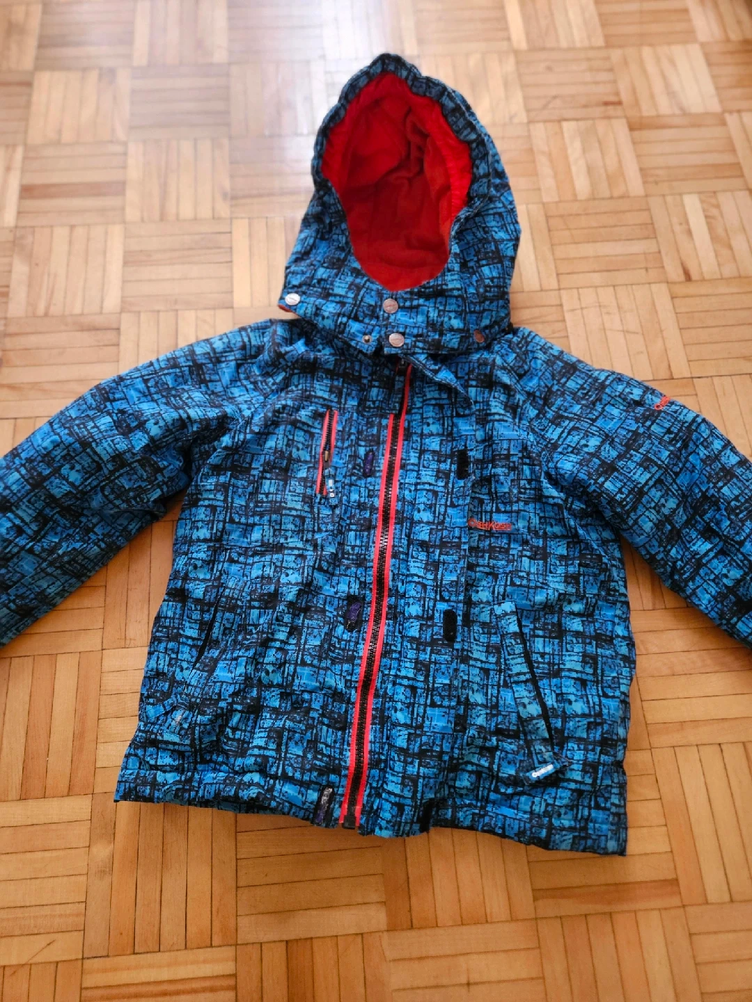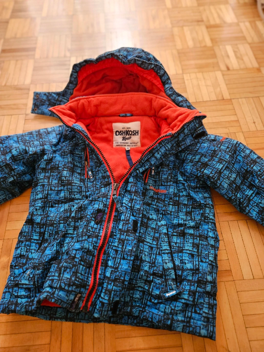 207Here's a cozy OshKosh B'gosh winter jacket that's perfect for keeping your little one warm! It has a fun blue and black patterned design with a bright red lining in the hood. It's in great condition and ready for the cold weather!