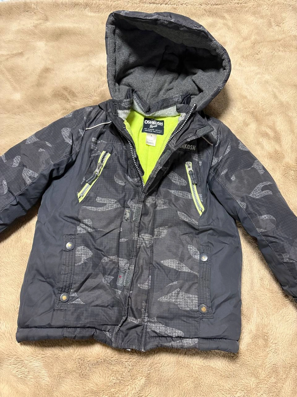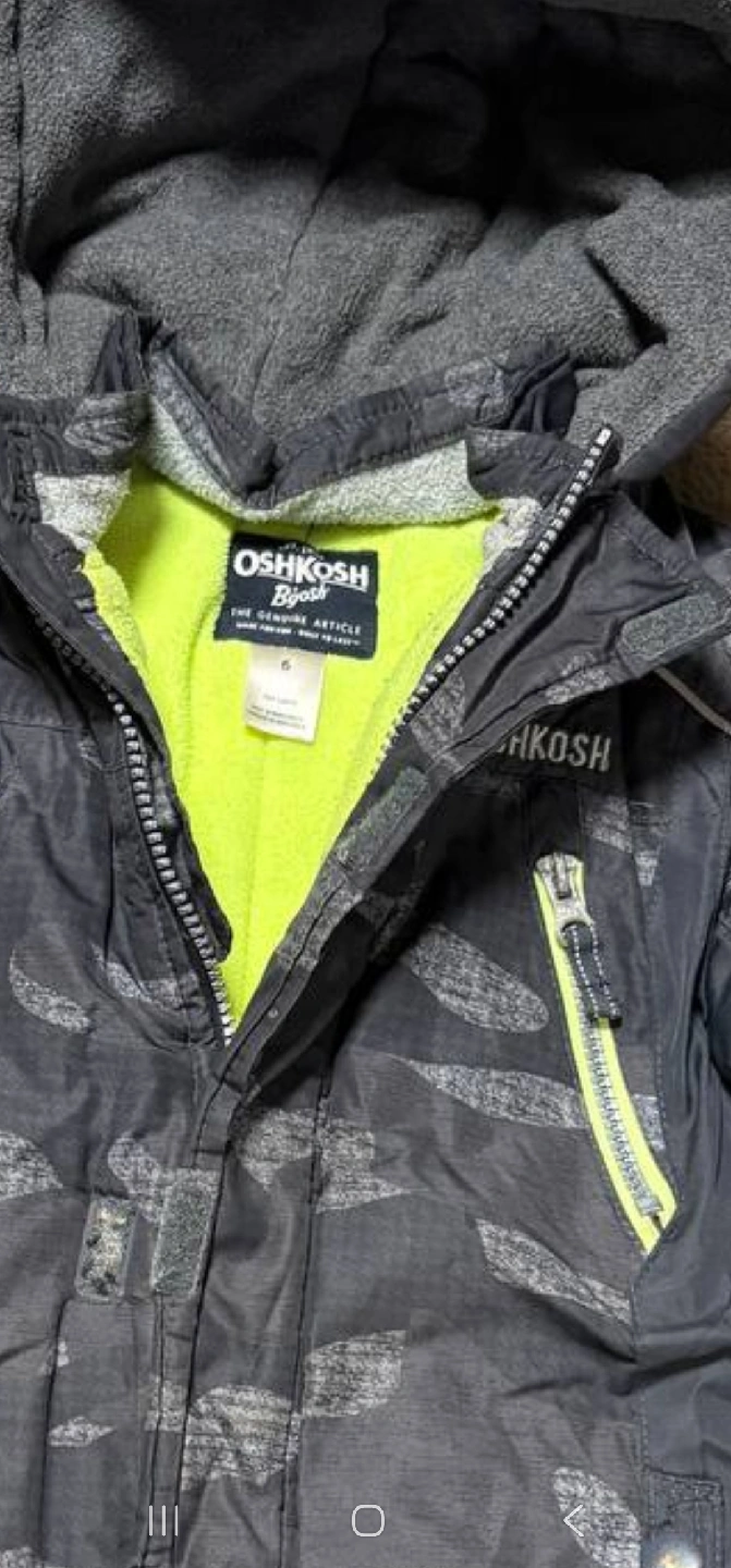 91Selling a gently used OshKosh B'gosh boys' winter jacket in size 6. It's got a cool camo pattern and a bright neon green lining. Perfect for keeping your little one warm this winter!