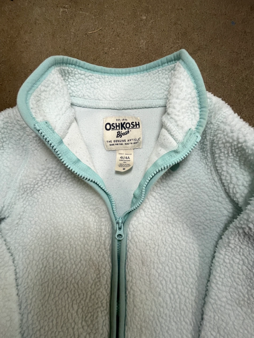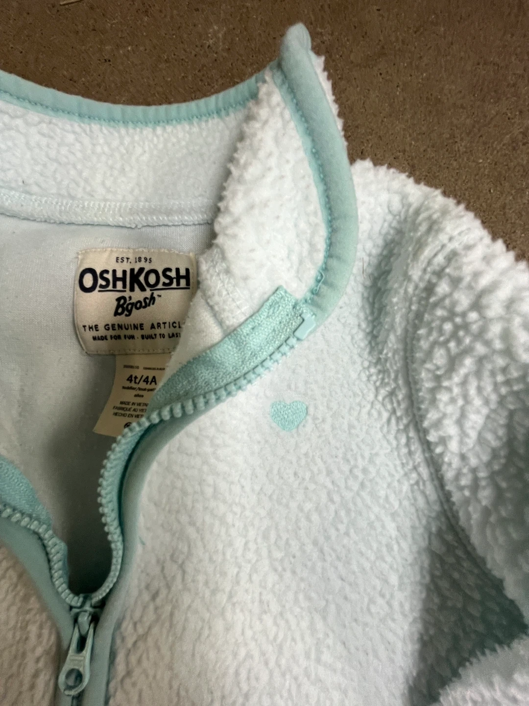 70Super cute and cozy OshKosh B'gosh fleece jacket in size 4T! It's a lovely light blue colour with a soft, fuzzy texture. Perfect for keeping your little one warm and stylish.