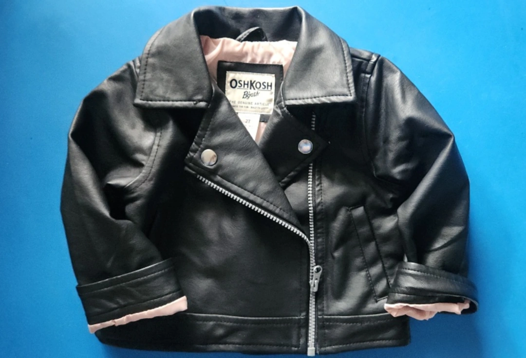 20Adorable girls' black faux leather jacket. Size 2T. Asymmetrical zipper closure. Features silver-toned hardware. Pink lining.