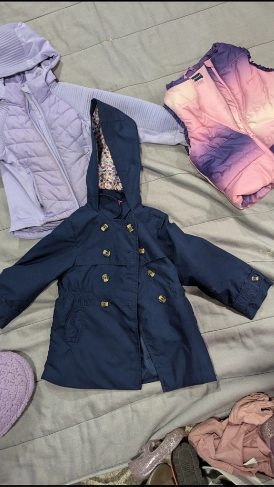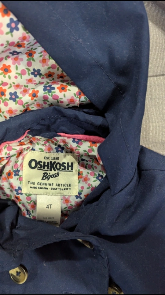 gifted and worn once. great for autumn days or layering. Selling a cute navy blue trench coat from OshKosh B'gosh! It's in great condition and perfect for keeping your little one warm and stylish. The lining has a cute floral pattern and it's a size 4T