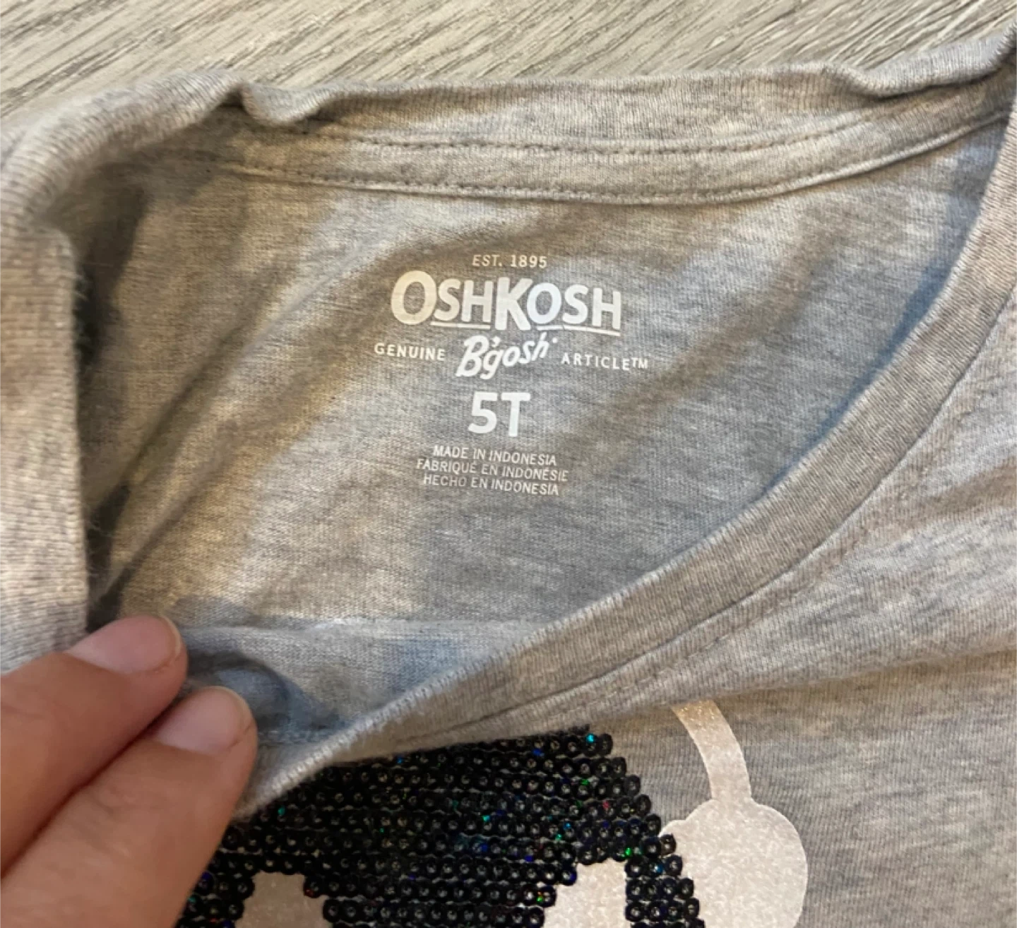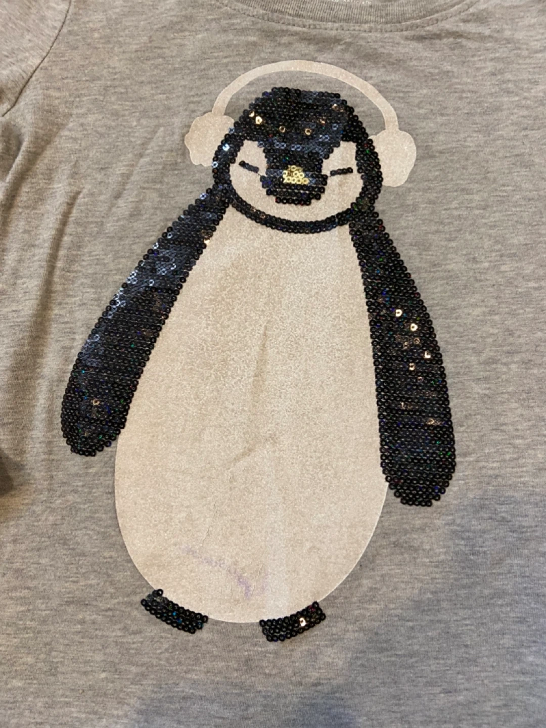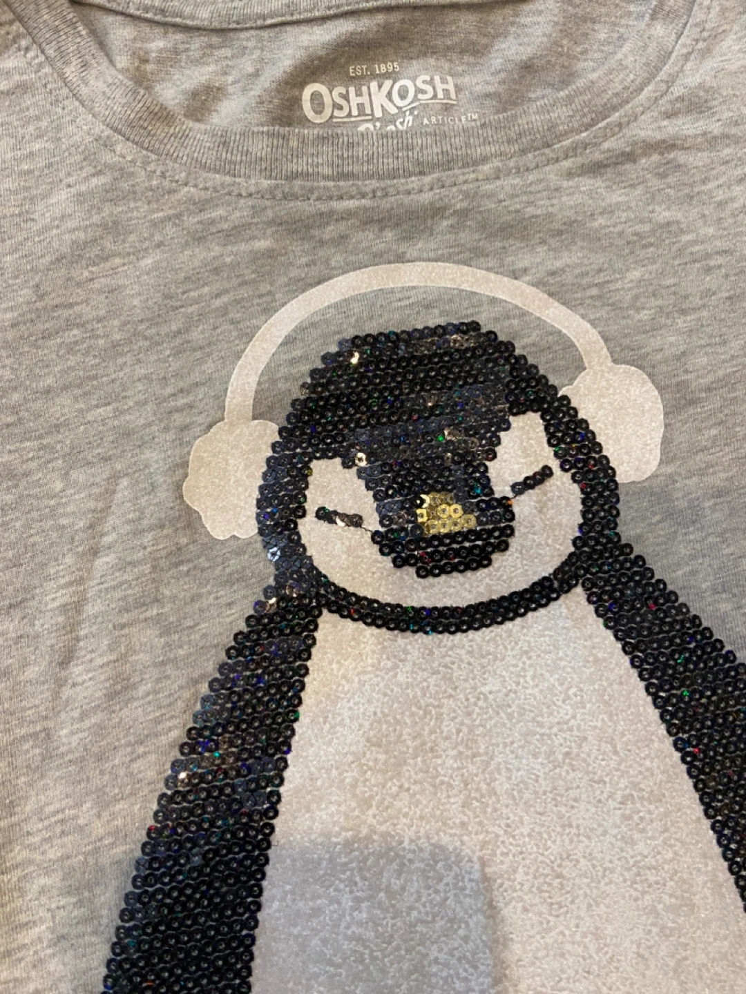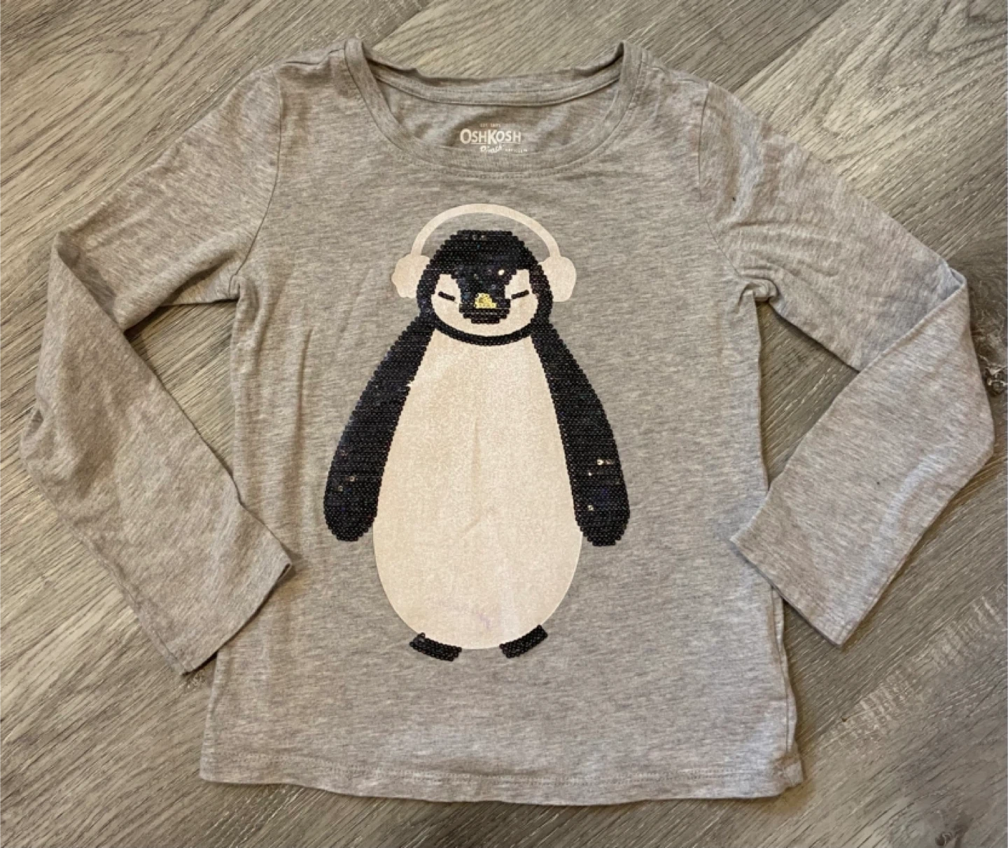 83Cute grey long-sleeve tee from OshKosh B'gosh! Features a sparkly penguin with headphones design. Size 5T and made of 100% cotton Message pick up time FCFS