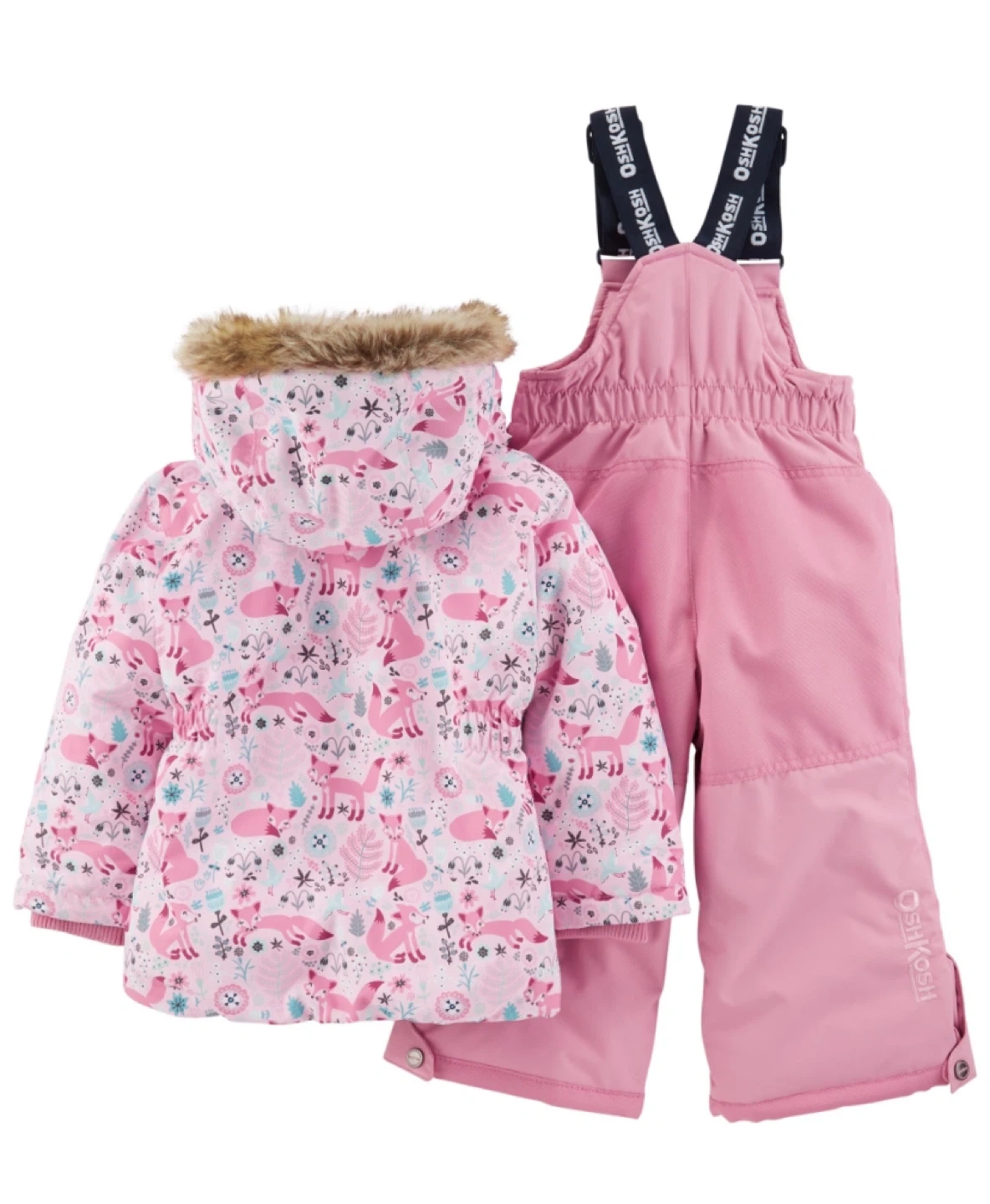 10Super cute OshKosh B'gosh snowsuit set! The jacket has a fun pink fox print and a faux fur-trimmed hood. The snow pants are a solid pink with adjustable OshKosh branded straps. Perfect for keeping your little one warm and stylish this winter!