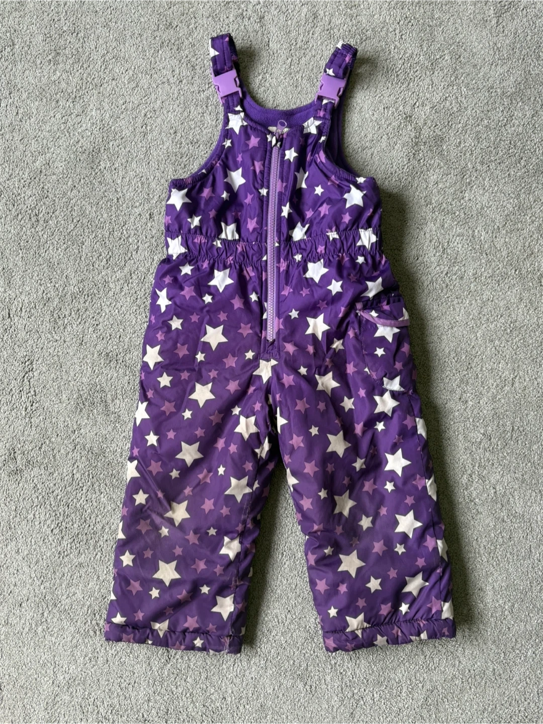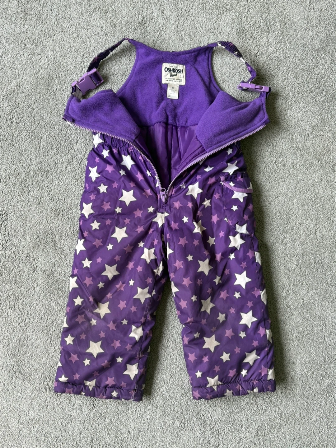 108Keep your little one warm with these OshKosh B'gosh snow pants! They are a vibrant purple colour with a fun star pattern. Size 3T. Perfect for playing in the snow! Some normal signs of wear but still in really good condition No smoking, no pet home