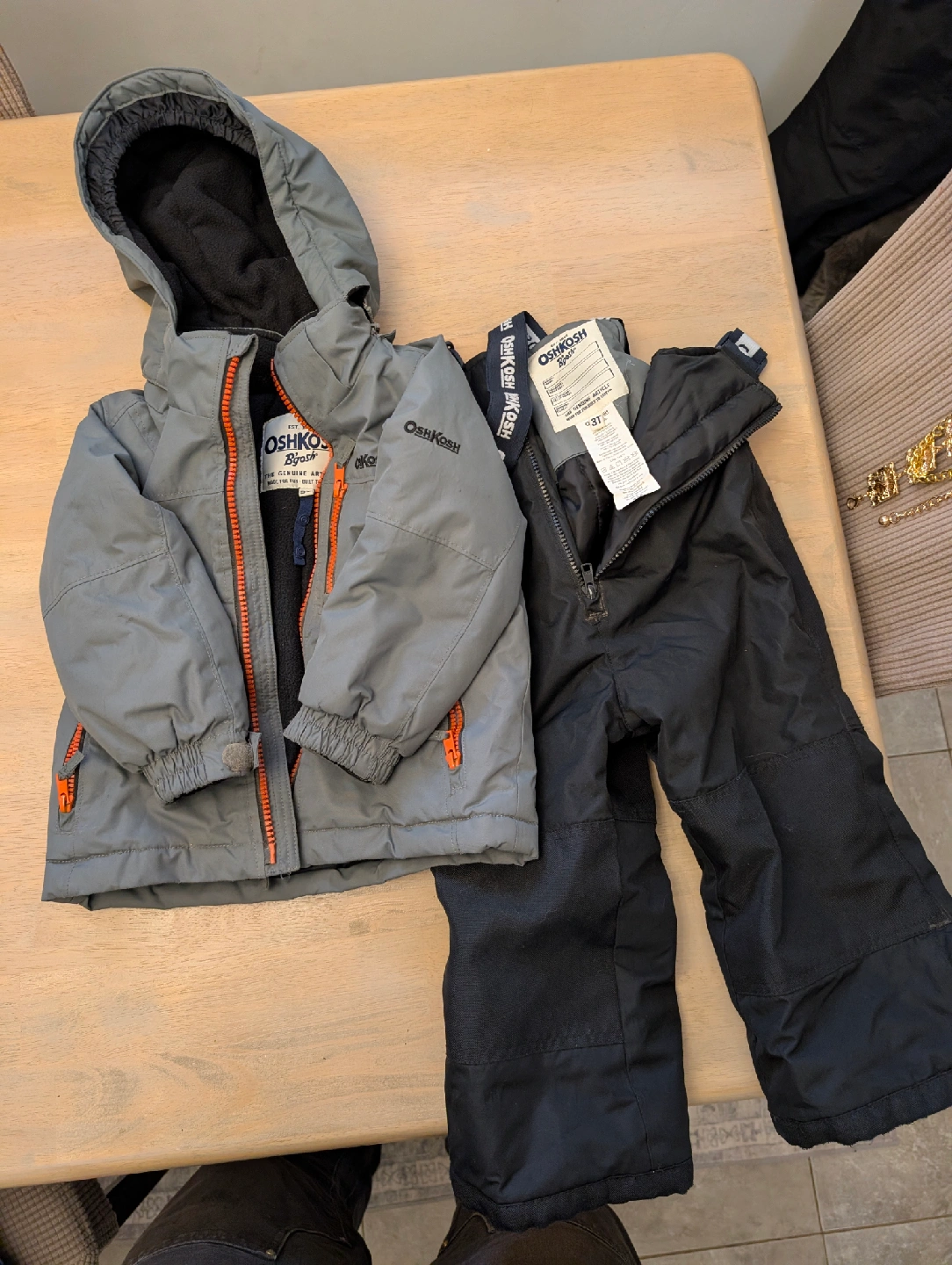 Keep your little one warm this winter with this gently used OshKosh snowsuit set! It includes a grey hooded jacket with orange zippers and black snow pants with adjustable suspenders. Perfect for playing in the snow or just staying cozy on cold days. Kid size 3T
