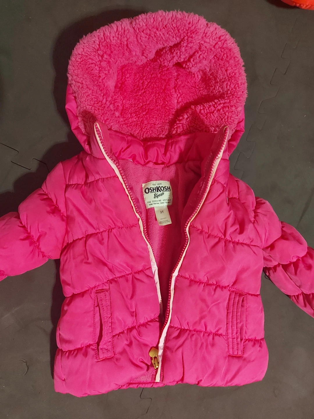 10Selling a cute and cozy pink puffer jacket from OshKosh B'gosh! It's in great condition and perfect for keeping your little one warm during the colder months. The size is 2T.