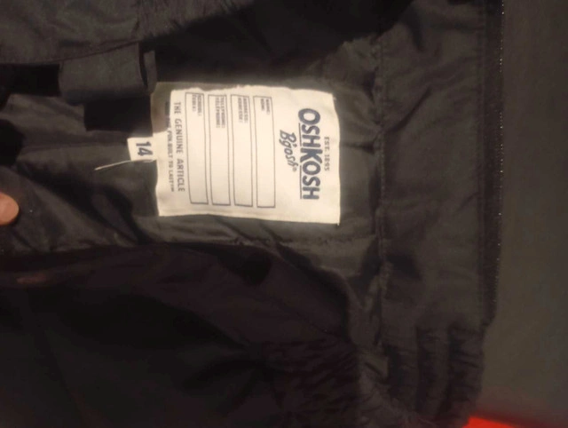 Keep your child warm this winter with these OshKosh black snow pants in a kids size 14! These pants are used but in good condition, ready for another season of fun in the snow. * Size: Kids 14 * Colour: Black With a price that won't break the bank, these snow pants are a fantastic deal. Snatch them up before they're gone, because winter waits for no one! If you're reading this, yes, they're still available! Size: Size 14 Boys Clothes For Sale By: Owner