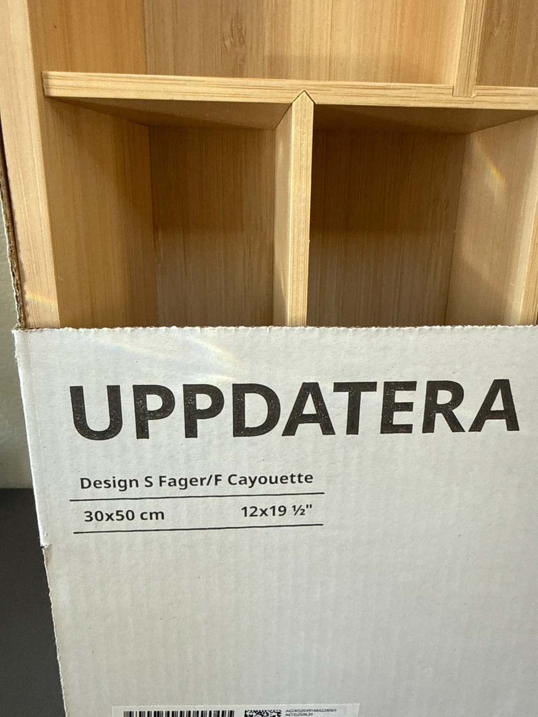 This is an IKEA UPPPDATERA cutlery tray. It's made of bamboo and measures 30x50 cm. It has multiple compartments for organizing your kitchen utensils. Perfect for keeping drawers tidy!