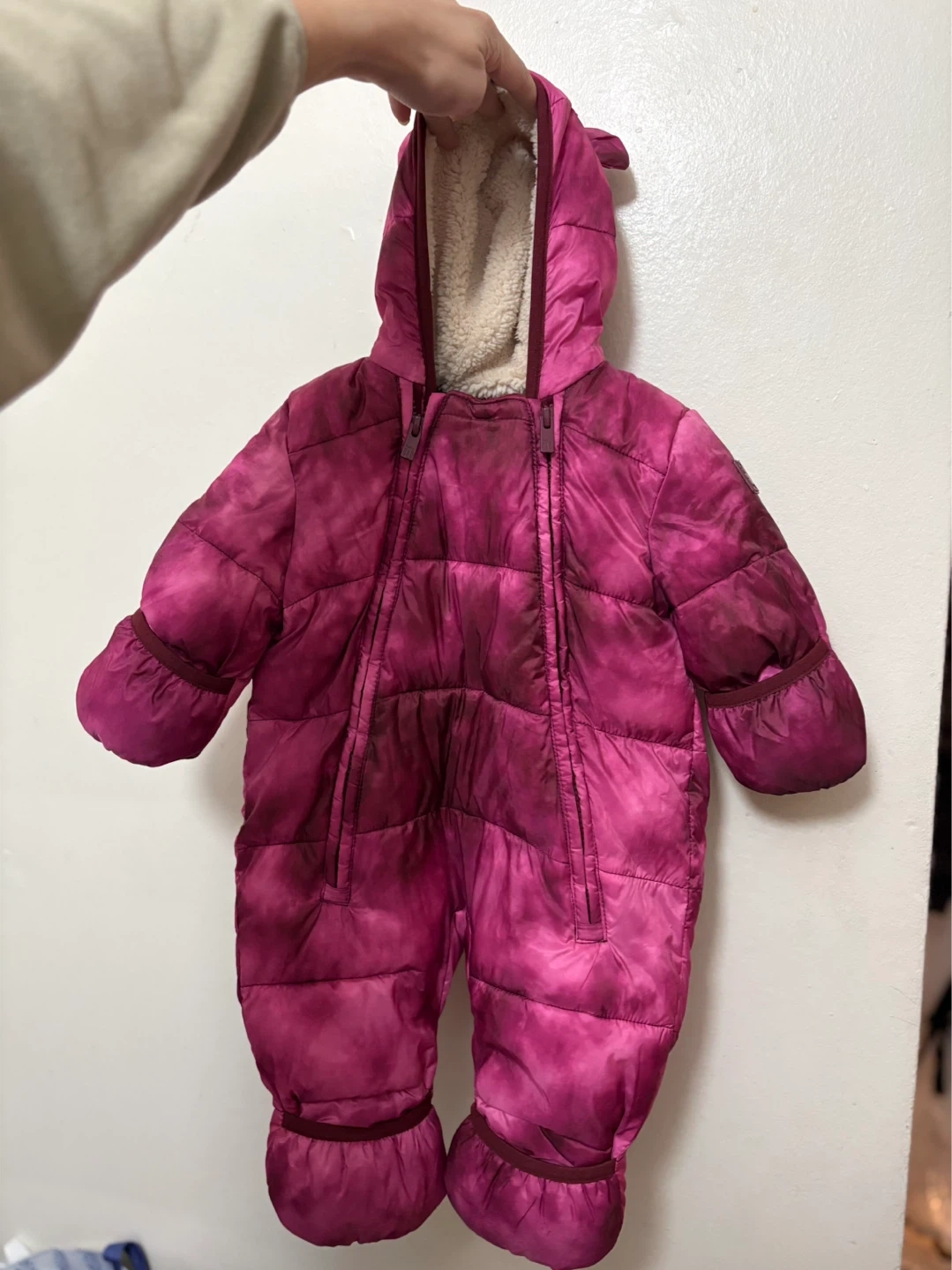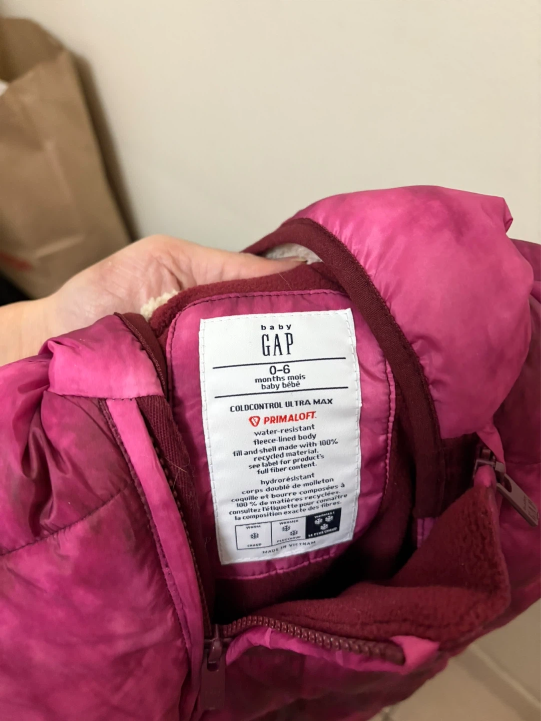 Baby Gap water-resistant fleece-lined snowsuit. Made with 100% recycled materials and full Primaloft fill. Suitable for 0-6 months.