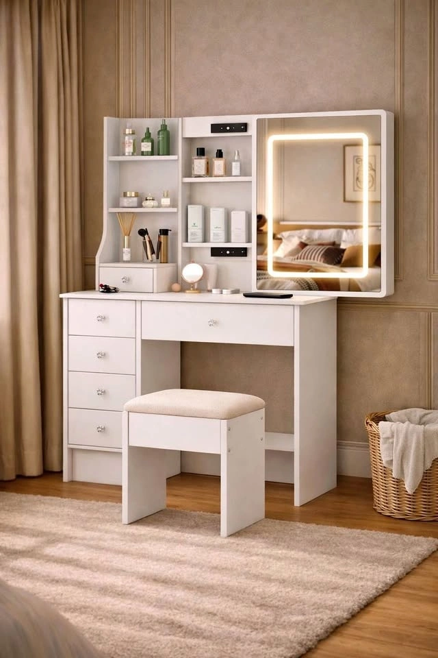 Modern Lighted Makeup Vanity with Sliding Mirror + Stool