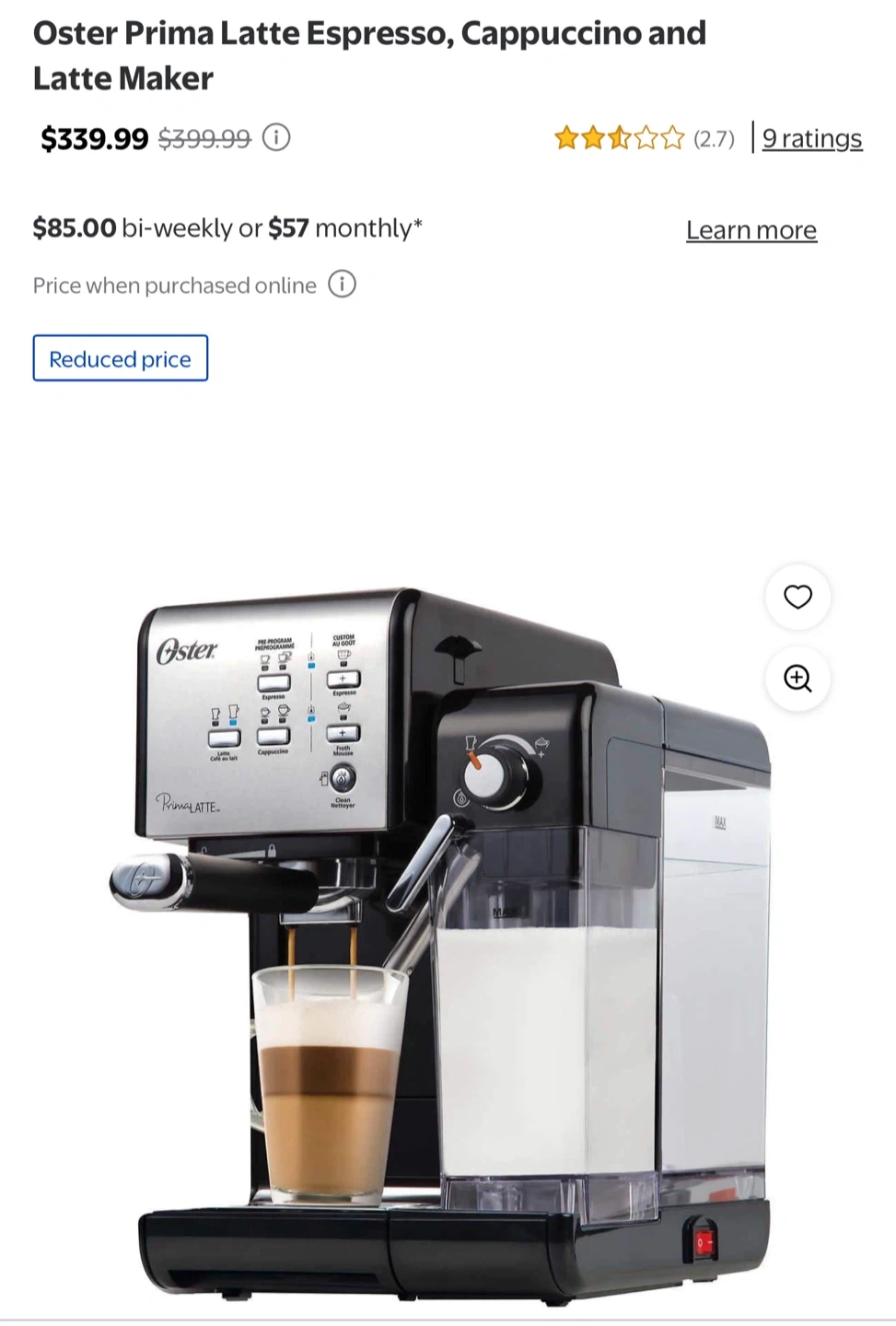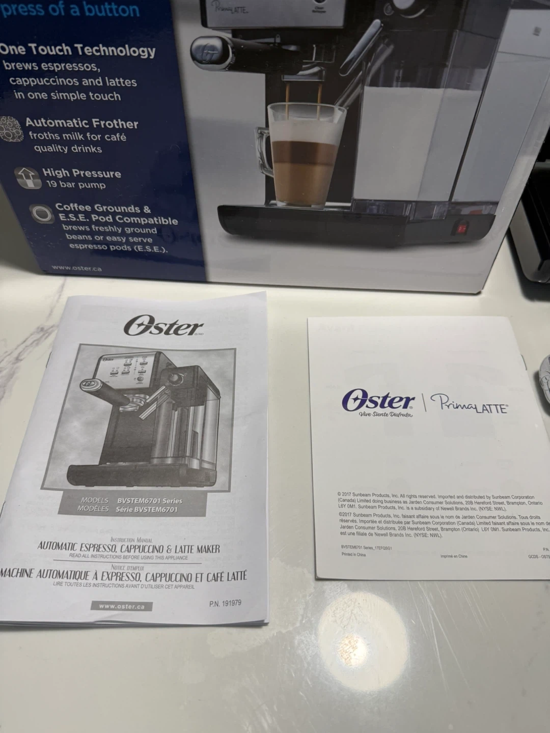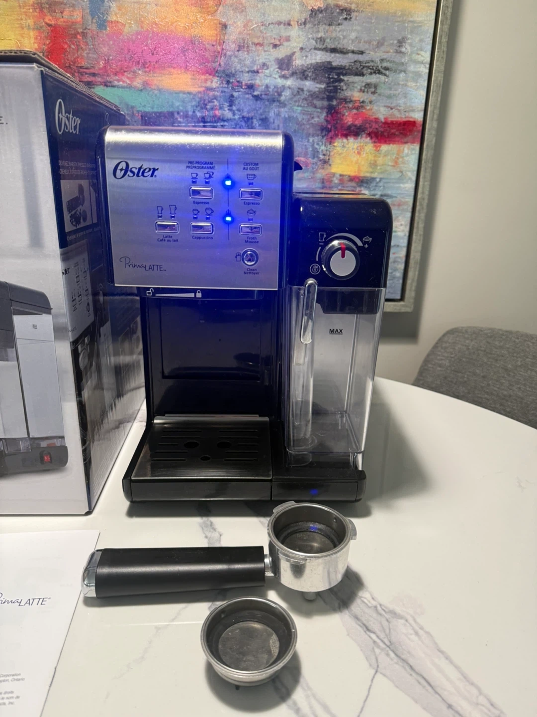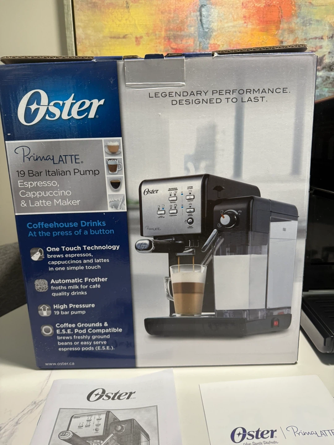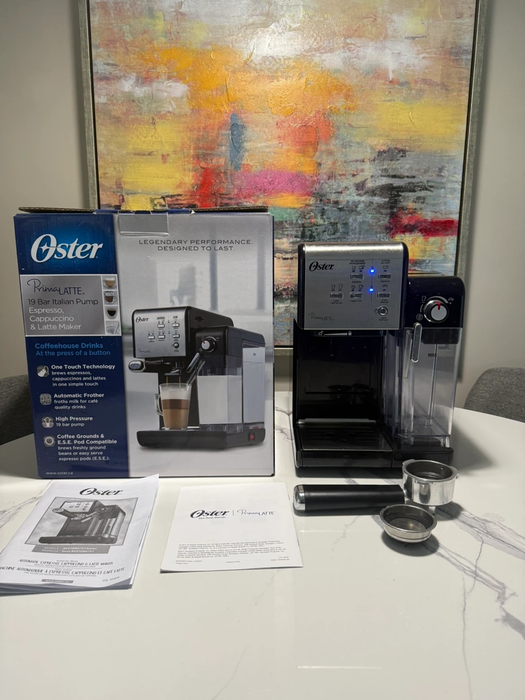 Selling an Oster PrimaLatte espresso, cappuccino, and latte maker! It's in great shape and comes with the box and all original components. This machine uses a 19 bar Italian pump for high pressure and one-touch technology for brewing espressos, cappuccinos, and lattes. It also has an automatic frother for milk. It's compatible with both coffee grounds and E.S.E. pods.