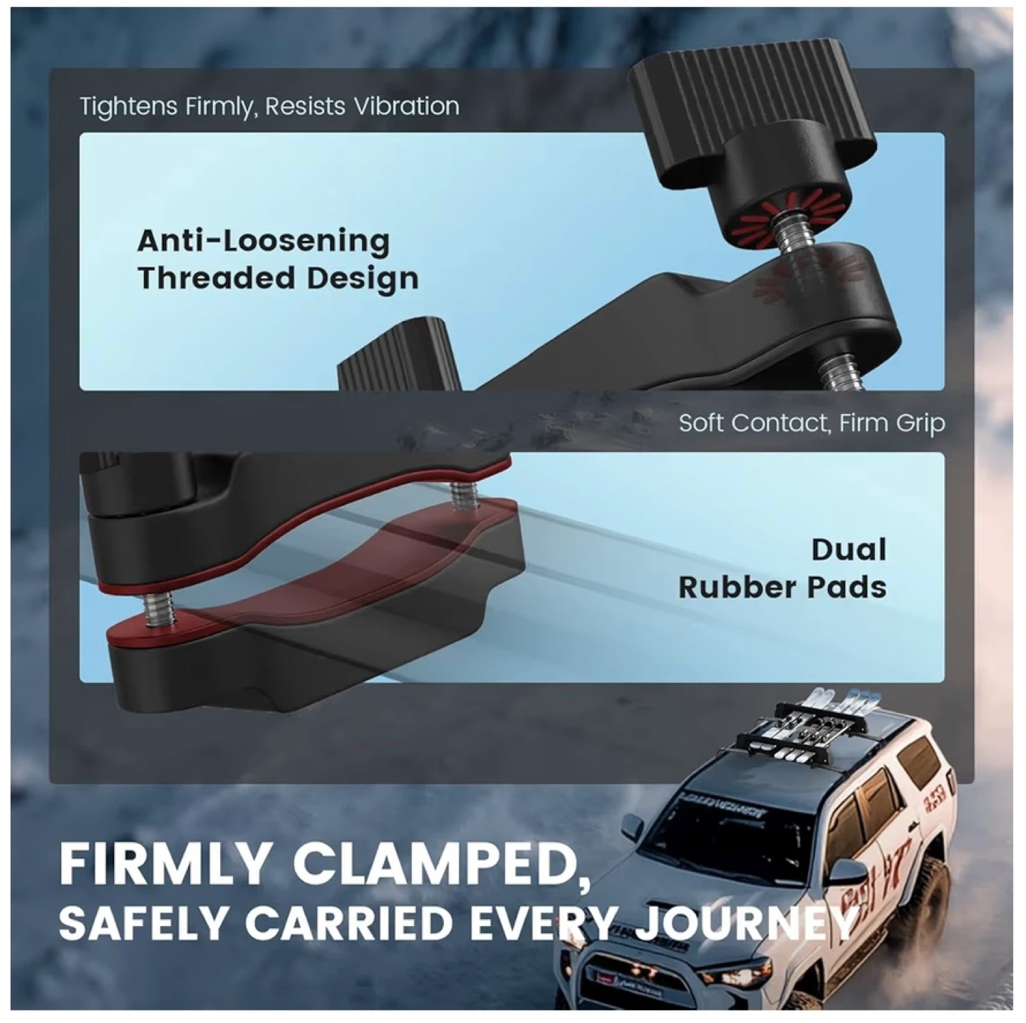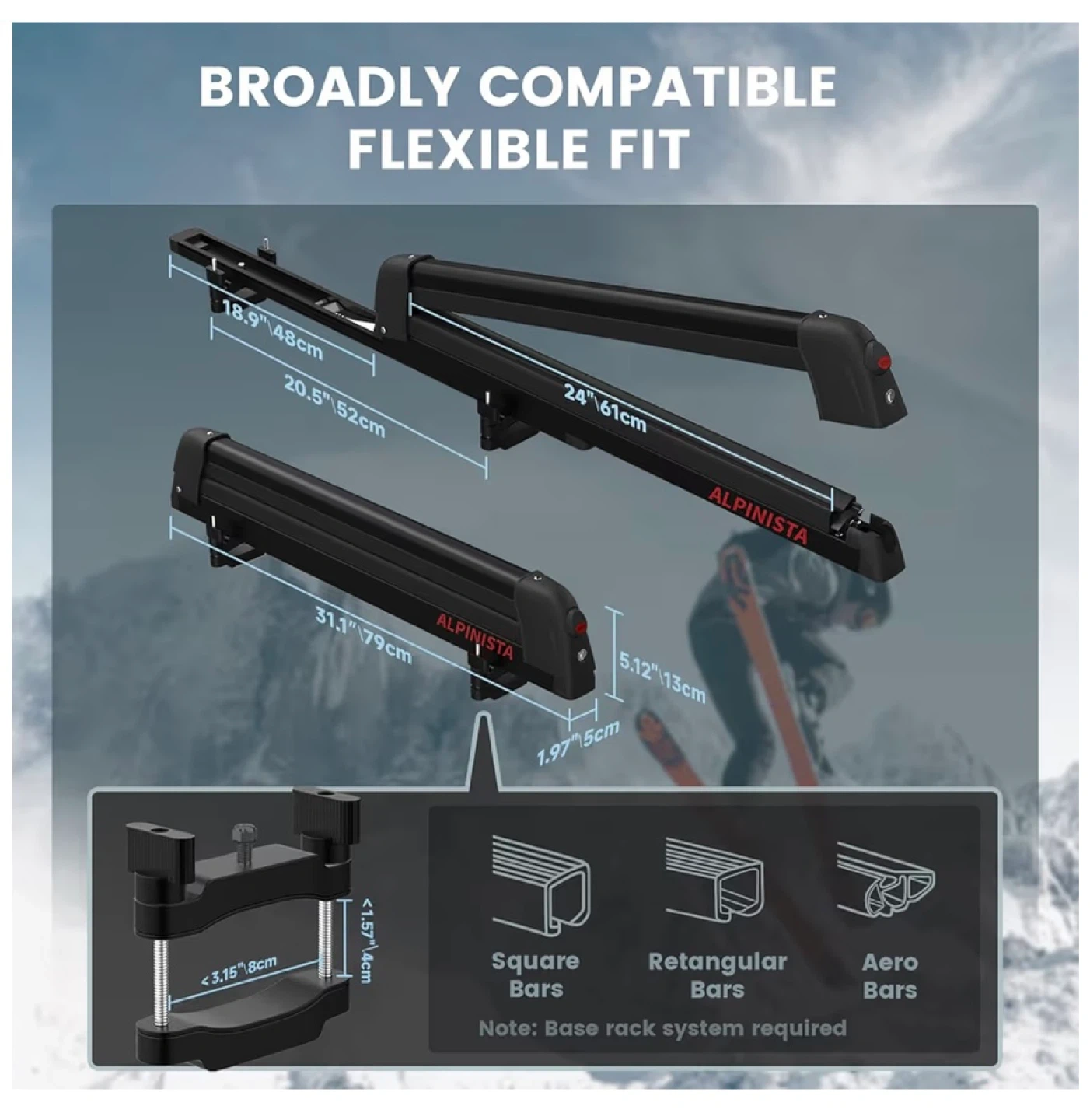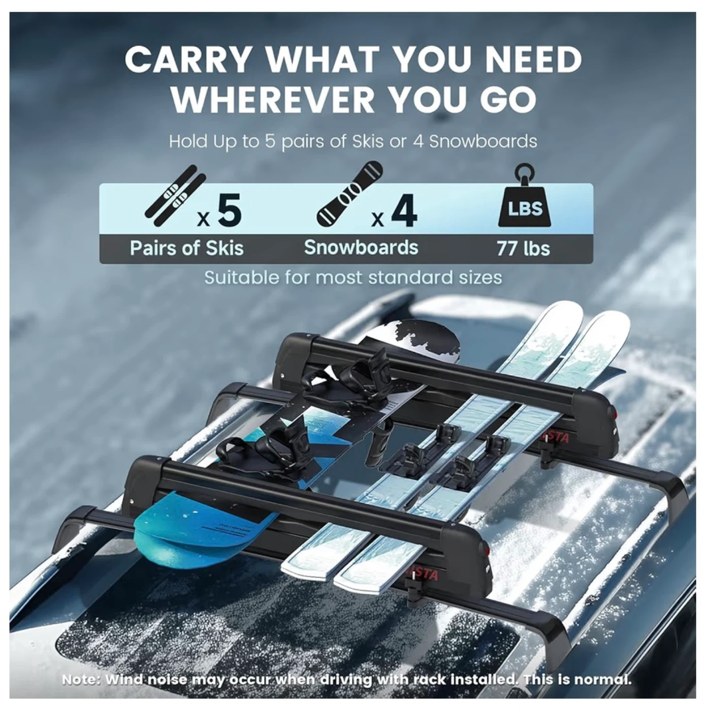 Carry up to 5 pairs of skis or 4 snowboards with this Alpinista roof rack. It features an anti-loosening threaded design and dual rubber pads for a secure, vibration-resistant grip. Tool-free installation makes setup quick and easy.