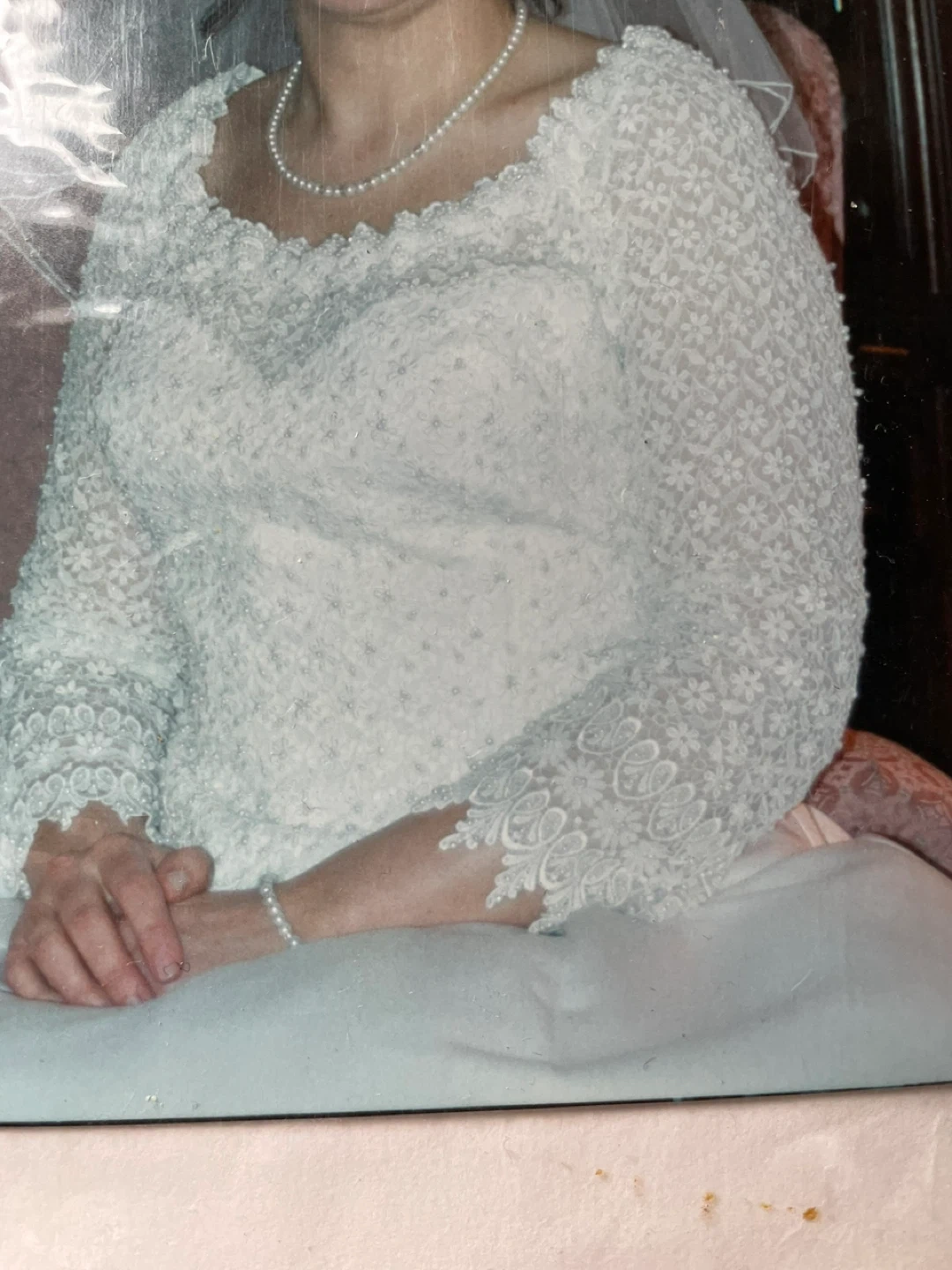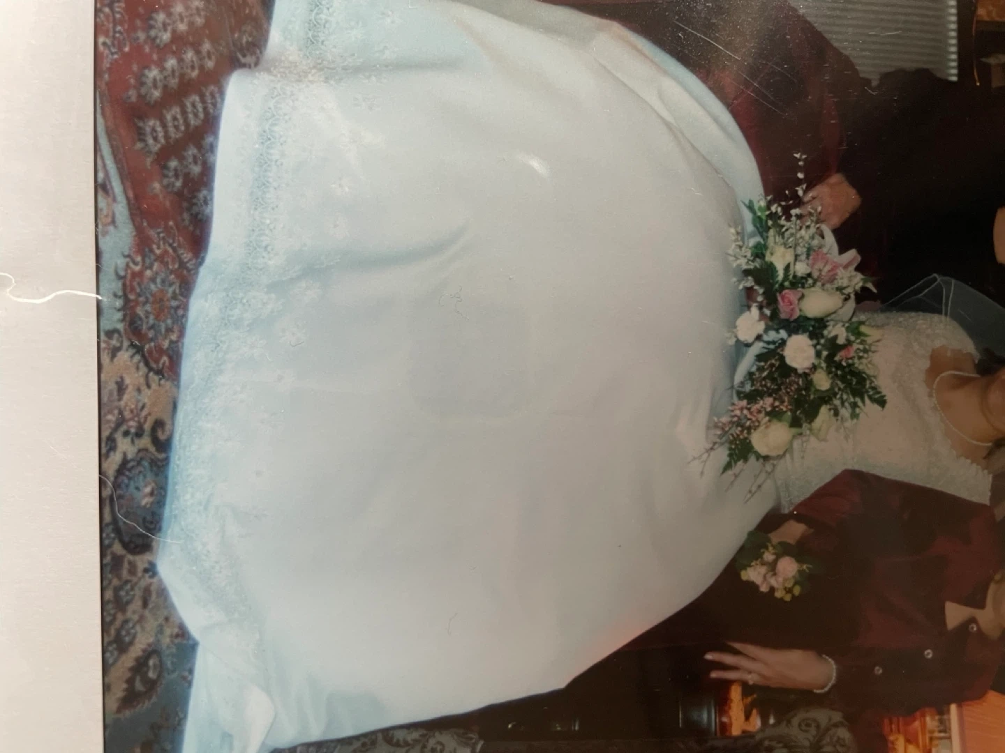 Beautiful white wedding dress featuring intricate lace detailing throughout. It has elegant long sleeves and a full skirt. This dress is perfect for a bride seeking a classic and romantic look on her special day! Still in preservation box.