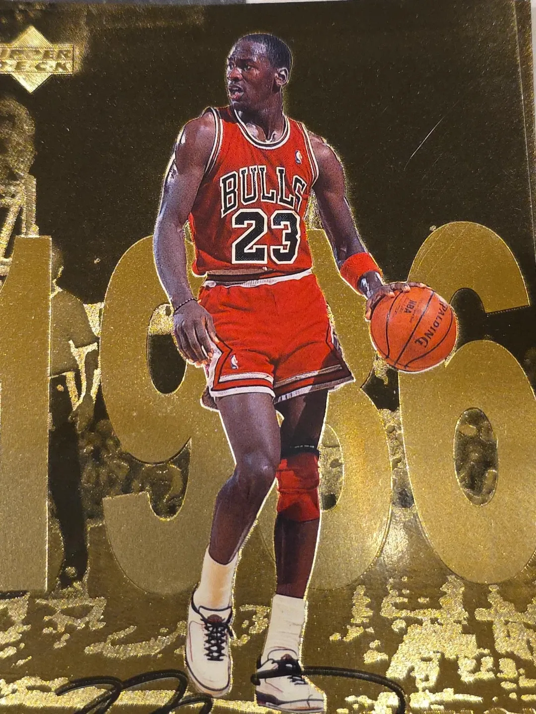 This is an Upper Deck Michael Jordan trading card from 1996. It features a gold foil design with Michael Jordan in his Chicago Bulls uniform. A must-have for any basketball card collector!