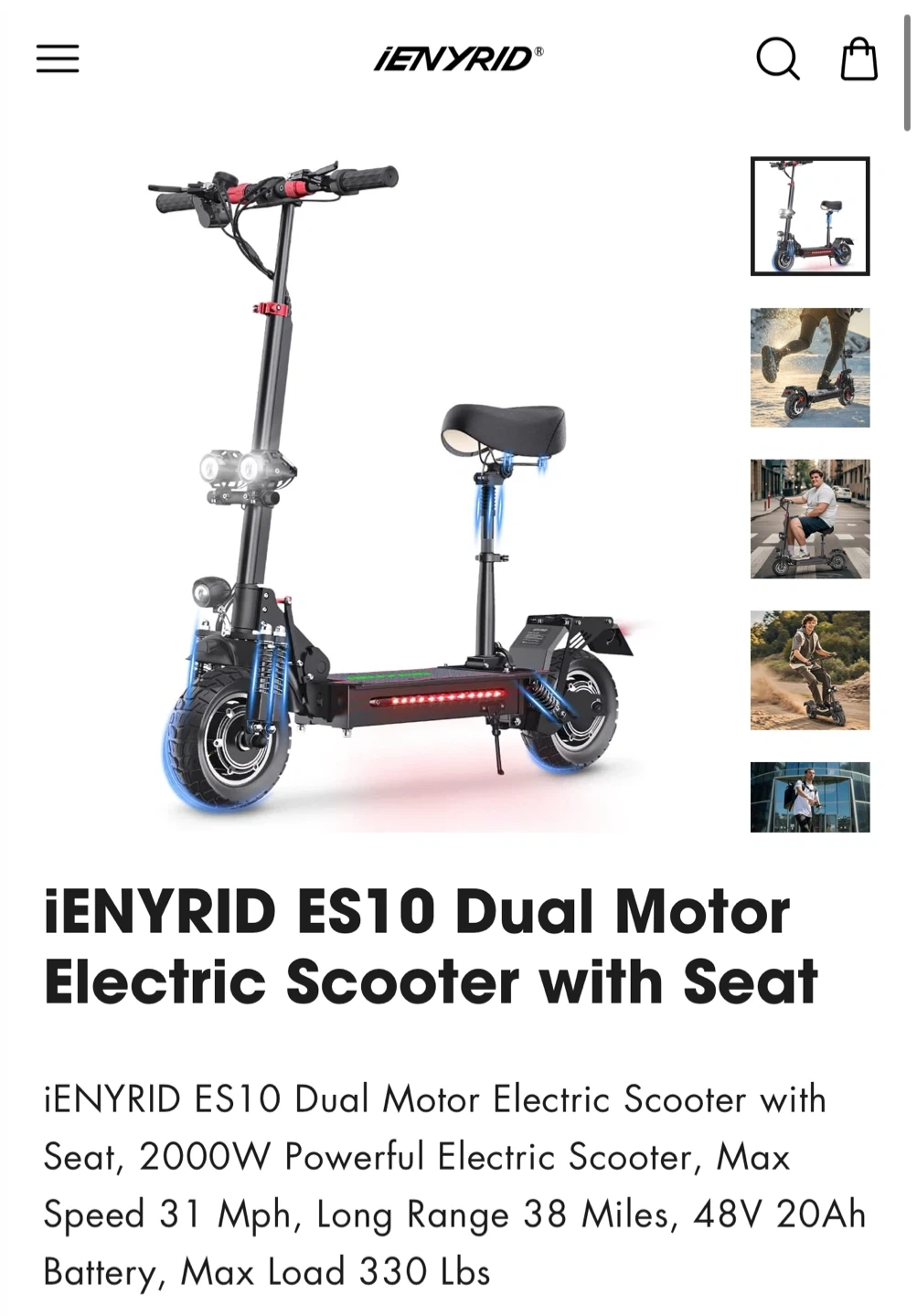 This iENYRID ES10 electric scooter features dual motors and a seat. It has a 2000W motor, a max speed of 31 mph, and a long range of 38 miles. The battery is 48V 20Ah with a max load of 330 lbs.