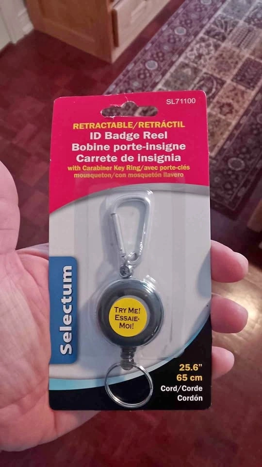 New retractable ID badge reel with a carabiner key ring. Cord length is 25.6 inches (65 cm). Brand is Selectum. New, never opened.