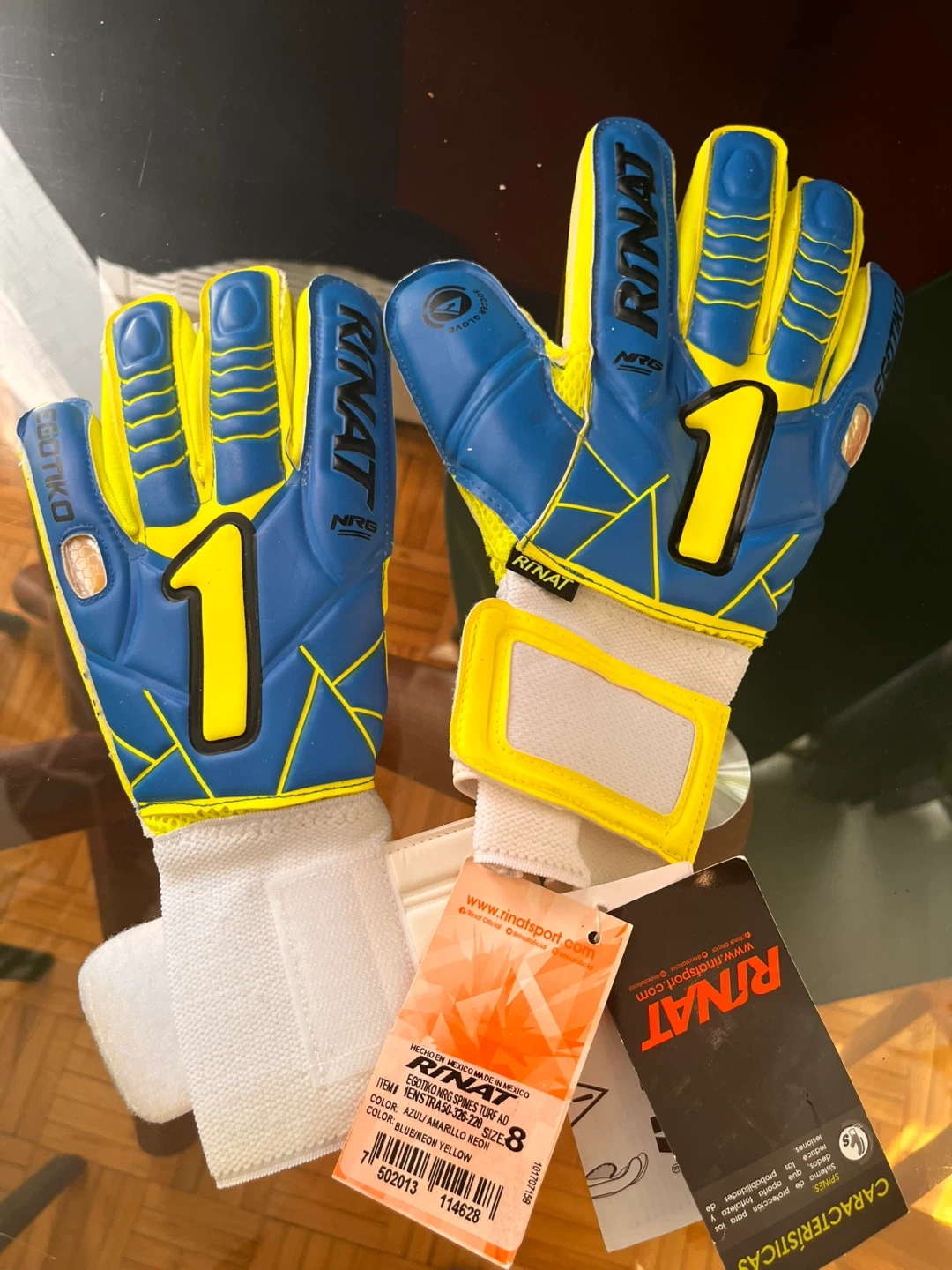 Selling a brand new pair of RINAT soccer goalkeeper gloves (Model: Egotiko NRG Spines). Never used, still with tags and carrying case.