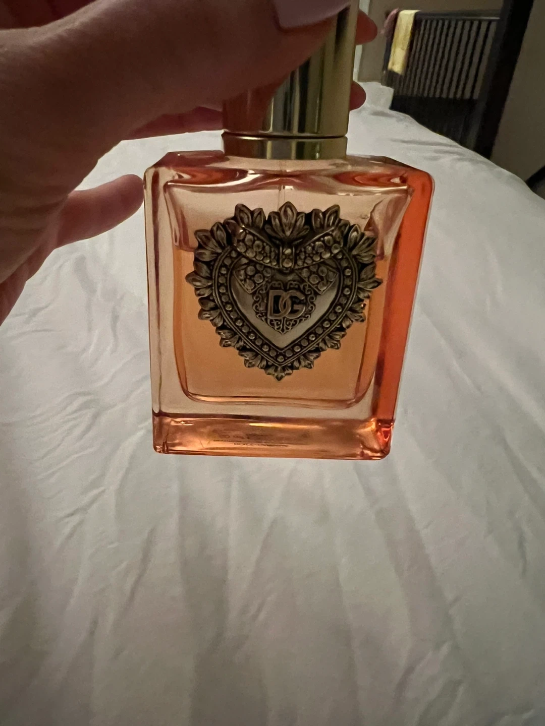 This is a bottle of Dolce & Gabbana devotion Eau de Parfum. It has a distinct heart-shaped emblem on the front. The liquid inside is a peachy-orange colour. 50 ml. Used.